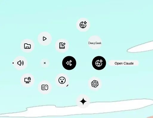 罗技MX Master 4设计上最大的变化就是拇指位置的一整块Actions Ring智能行动环,用大拇指点击智能行动环会有触觉反馈提示,并且在你的桌面上出现圆形菜单,提供了8个默认的快捷选项,你完全可以按照你的习惯来完全更改这些快捷选择,例如我经常使用的AI主要是ChatGpt、Gemini和Claude,通过简单的设置就能完全符合我的工作流习惯。