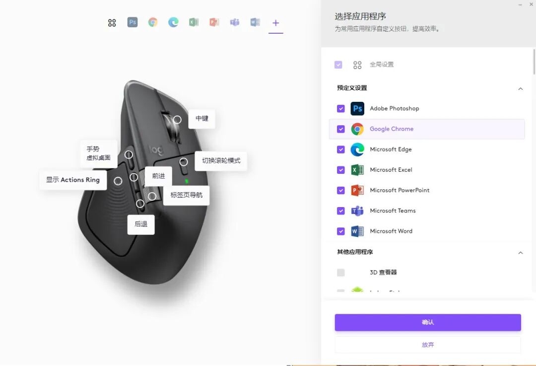 随着你在Photoshop、Chrome、Excel表格之间切换,Actions Ring智能行动环也能基于当前应用程序预设切换不同的快捷按钮,同时针对不同的应用程序鼠标上的按钮快捷操作也会有所变化,以满足实际的快捷操作,几乎就是罗技MX Master 4尽可能的让你少移动,在点击之间就实现过去繁琐的操作。