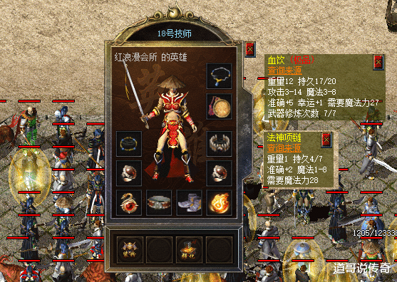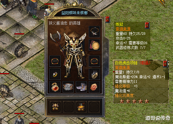 第一,炼狱运九套如上图所示,这位天魔英雄来劲了,主要是天魔神甲是重装之中价值最高的。手持的炼狱没有升级攻击属性,但是加了7点幸运值,搭配一根运2白色虎齿项链也成运九套了,在现阶段的输出已经很炸裂了。