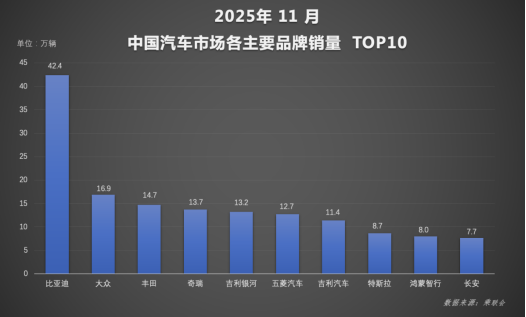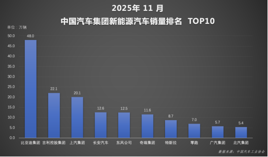 2025年收官之际,车市冲刺氛围浓厚,比亚迪以强劲势头再创佳绩。11月单月销量突破48万辆,刷新年内新高,稳居新能源汽车品牌与单一品牌销量“双冠王”宝座。在新能源渗透率持续提升、出口规模不断扩大的行业背景下,比亚迪表现亮眼持续领跑。