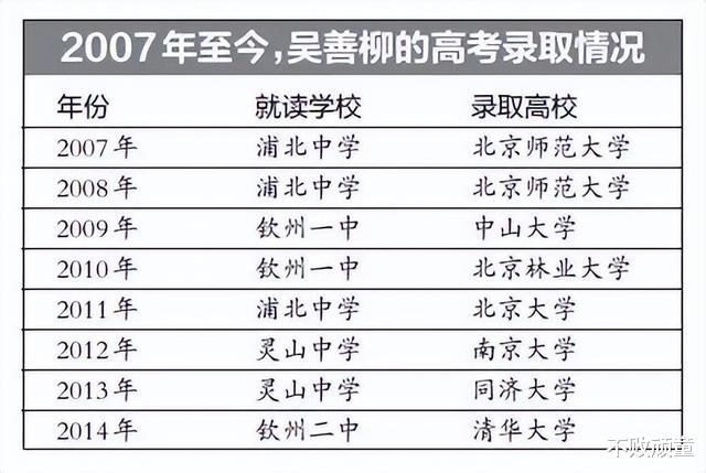 复读考清华,2007年吴善柳辞掉工作回家复读准备参加高考,此时距离高考只有三个月,已经六年没有摸过高中书本的吴善柳凭借聪慧以优异成绩被北京师范大学录取。
