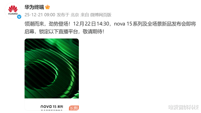 今日,华为终端官方发布“发布会直播一张图”,清晰表示出发布会时间和主要直播平台,感兴趣的伙伴可以同步关注起来了。至此,在华为官方释放物料和外围爆料后,华为nova 15系列的核心看点已大致明确。12月22日正式发布会的关注热度也随之推向高潮。其极有可能在外观设计、影像系统、操作系统及通信能力上实现全方位突破,外界普遍预测这或许是“nova史上最强一代”,或将带来产品力全面回归。