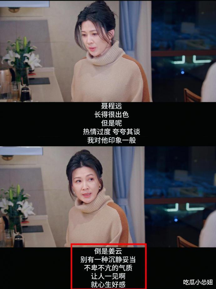 ▪️背后见人品各自回家后,两人在子女面前,没有一句挑剔和坏话。曦光妈回忆:当年我们创业,盛小姐一点架子都没有,愿意给我们普通人机会。屿森妈夸赞:姜云不卑不亢、沉静妥当,有商业头脑,反而是聂盛远热情过度,夸夸其谈。——她们在子女面前,为对方树立了一座桥梁。