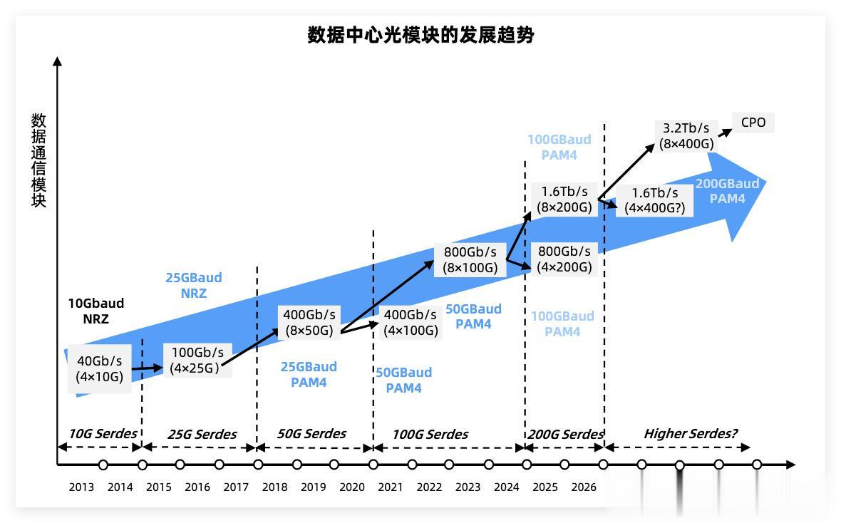 例如,应用于数据中心的光模块早期约每3-4年迭代一代,而自2023年以来,受AI算力需求爆发式增长影响,迭代周期已缩短至2年左右。