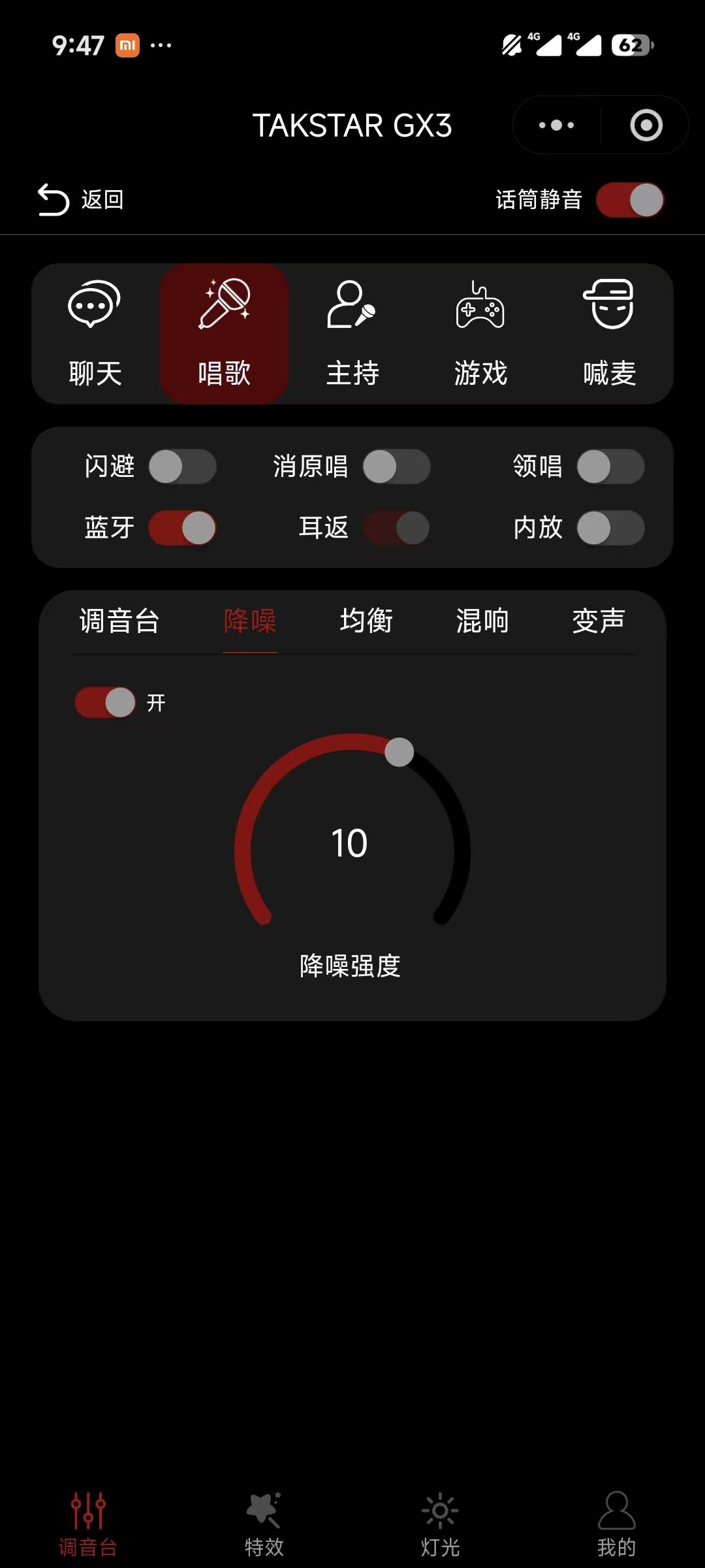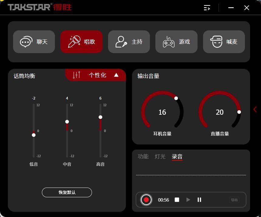 它还有高中低音三段均衡调节功能,而且每个模式都有各自的记忆功能。在直播模式下,我可以根据直播内容和氛围,调整高中低音的比例,让声音更有特色;在唱歌模式下,我可以根据歌曲的风格,调整均衡,让歌声更加动听。不同模式下可以调整各自不同的均衡,满足我多样化的需求。