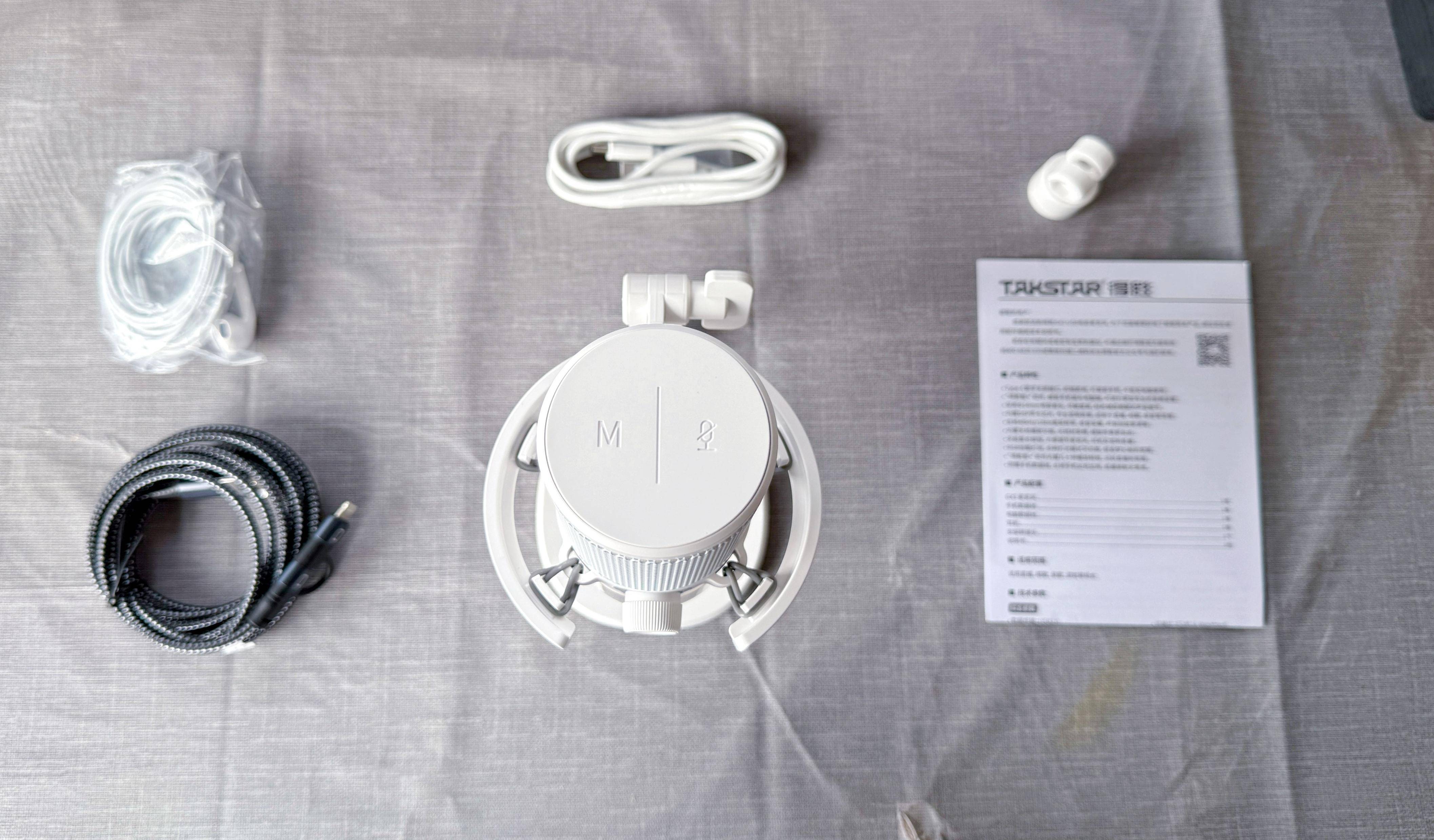 除了麦克风主体,它的配件也十分丰富。有支架转接头、手机数据线、电脑数据线、专业监听耳机和使用手册,这些配件摆放得整整齐齐,从细节处就能看出它的专业。