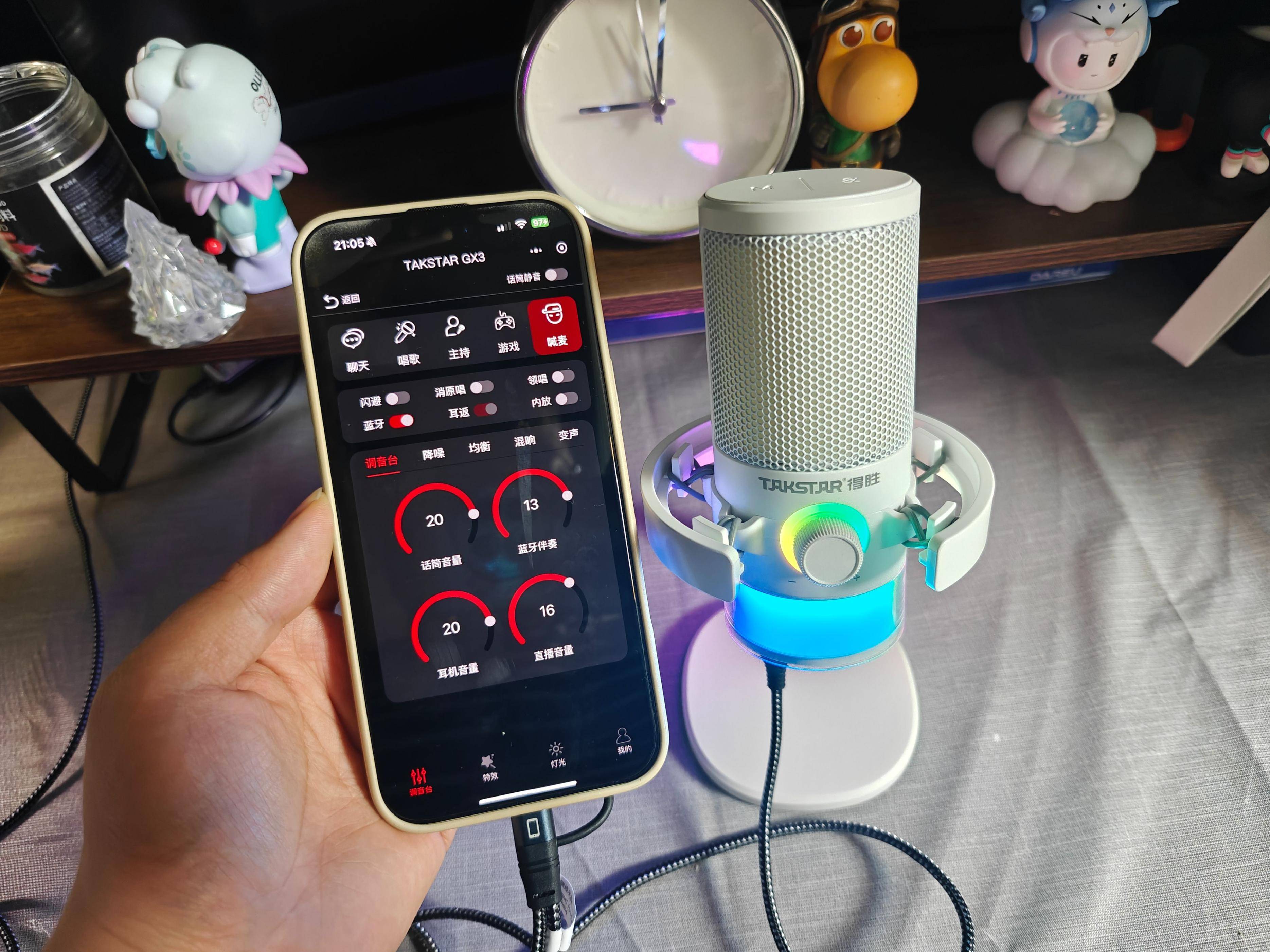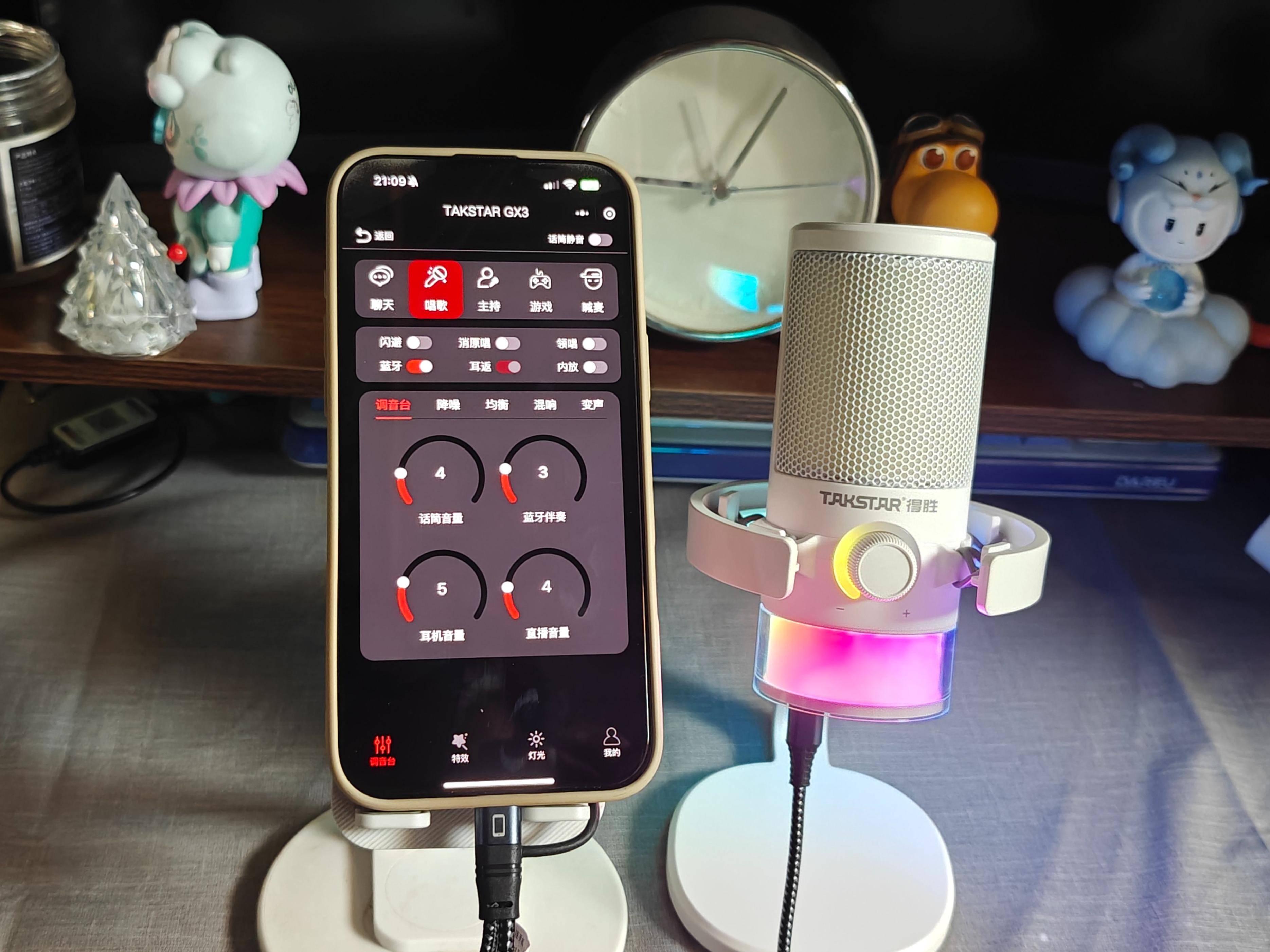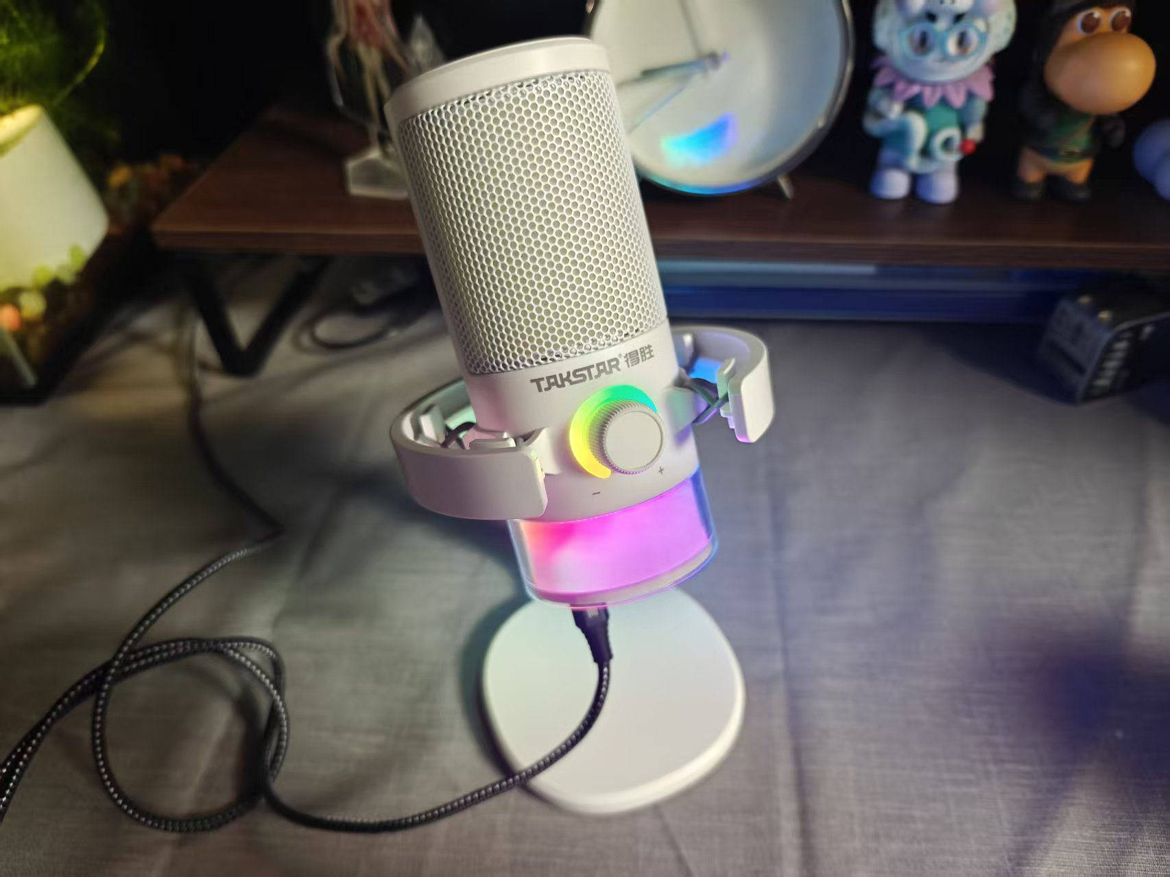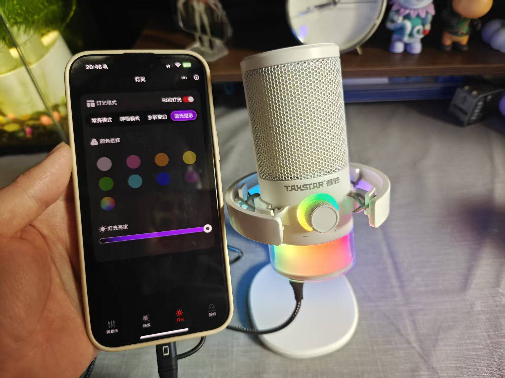 得胜GX3的灯光效果简直太酷了。它有9种灯光色彩可选,除了常亮、呼吸灯效模式,还新增了多彩变幻和流光溢彩两种灯光模式。多彩变幻模式下,灯光会不断变换颜色,就像一道绚丽的彩虹;流光溢彩模式下,灯光会像流水一样流动,特别梦幻。我可以通过“得胜智+”软件的灯光开关或者长按麦克风底部灯光按钮来关闭灯光。在直播的时候,我可以根据自己的喜好和直播氛围来选择不同的灯光效果,让直播更加个性化、更有氛围感。