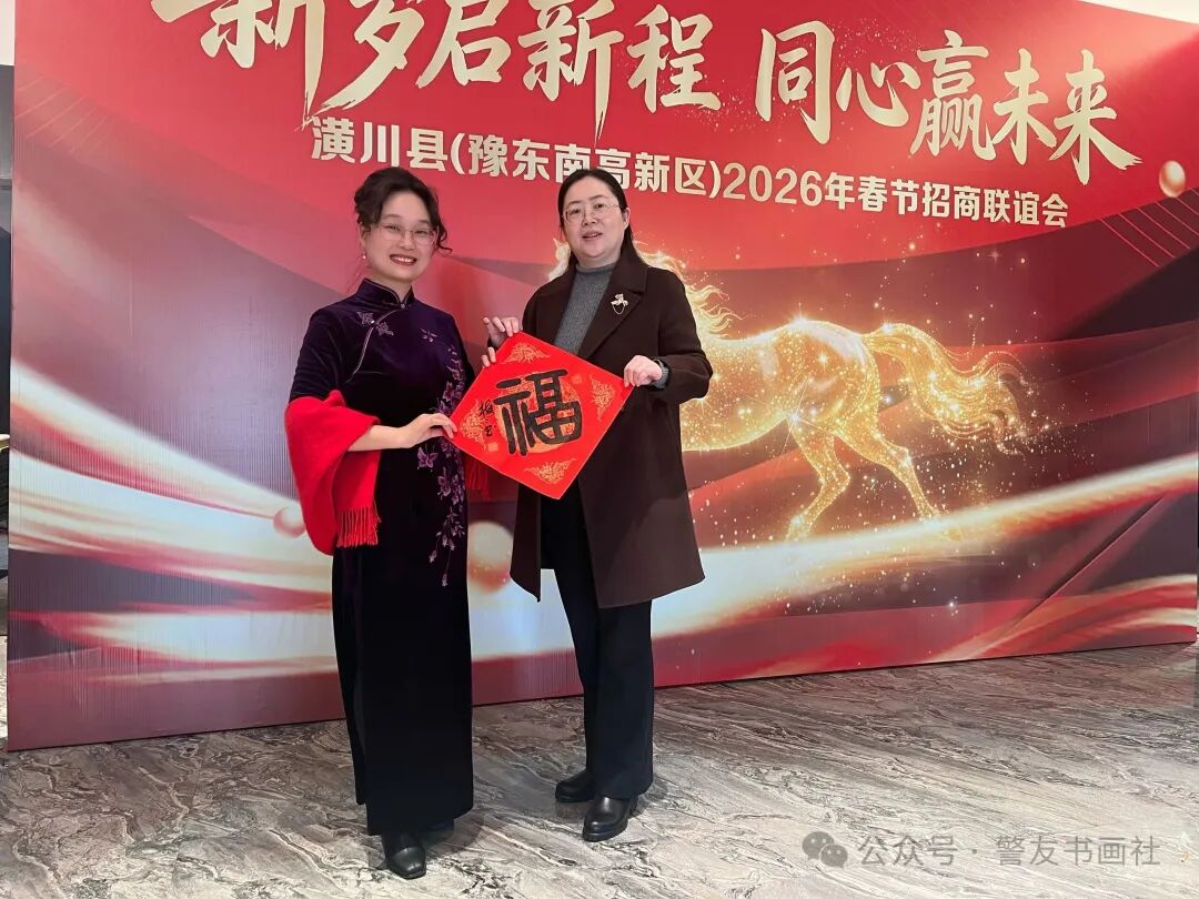 一花引来百花开,姚梅梅女士的发言受到在场嘉宾的热烈欢迎和交口称赞,选录王道成先生《墨韵凝祥福泽潢川——赞姚梅梅女士》:腊月二十六下午,豫东南的潢川大地,暖意融融,隐隐涌动着蓬勃的生机。潢川县县委政府豫东南高新区等组织的企业年会会场内,华灯璀璨,高朋满座,雅韵如潺潺溪流,在空气中悄然流淌。就在这时,中菲友好文化大使、中国女画家协会理事姚梅梅女士宛如春日里携着祥瑞与诗意的仙子,迈着轻盈而优雅的步伐翩然而至,瞬间为这盛会添上了浓墨重彩、熠熠生辉的一笔。姚女士之才情,恰似潢川那蜿蜒曲折、浩渺灵动的潢水。它既有奔腾不息、勇往直前的磅礴气势,又有润泽万物、细腻入微的温柔情怀。于年会之上,她以《滕王阁序》之千古雅韵为灵感源泉,饱蘸浓墨,一篇对潢川的深情礼赞跃然纸上,脱口而出。此等连珠妙语,如春风轻拂面庞,带着温暖与惬意,将潢川的山川秀美、人文厚重娓娓道来,让人仿佛置身于那如诗如画的美景之中;又似战鼓激昂奏响,带着豪迈与激情,赞县委书记、县长高瞻远瞩、运筹帷幄,颂企业家们拼搏进取、砥砺前行,令人心潮澎湃,斗志昂扬。 而那精心书写的《五福临门》,为这片土地带来无尽的福祉与安康;似一颗璀璨的明珠,闪耀着幸福的光芒,在浩瀚的夜空中熠熠生辉,照亮潢川人民前行的道路,引领他们走向更加美好的未来。这“福”字,不仅仅是书法艺术的瑰宝,更是姚女士对潢川这片土地深深的祝福与期许,是她用心灵之笔书写出的对潢川人民最真挚的情感。
