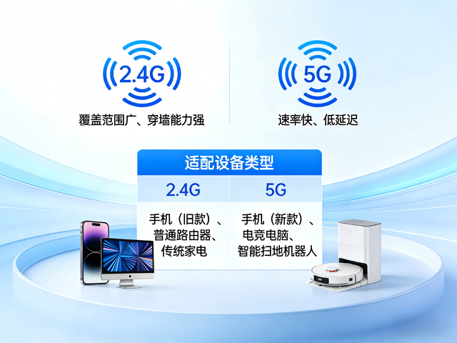 先搞懂:2.4G和5G频段的核心区别2.4G频段:穿墙能力强、覆盖范围广,但速率慢、干扰多(易受邻居路由、家电干扰),适合低速率设备。