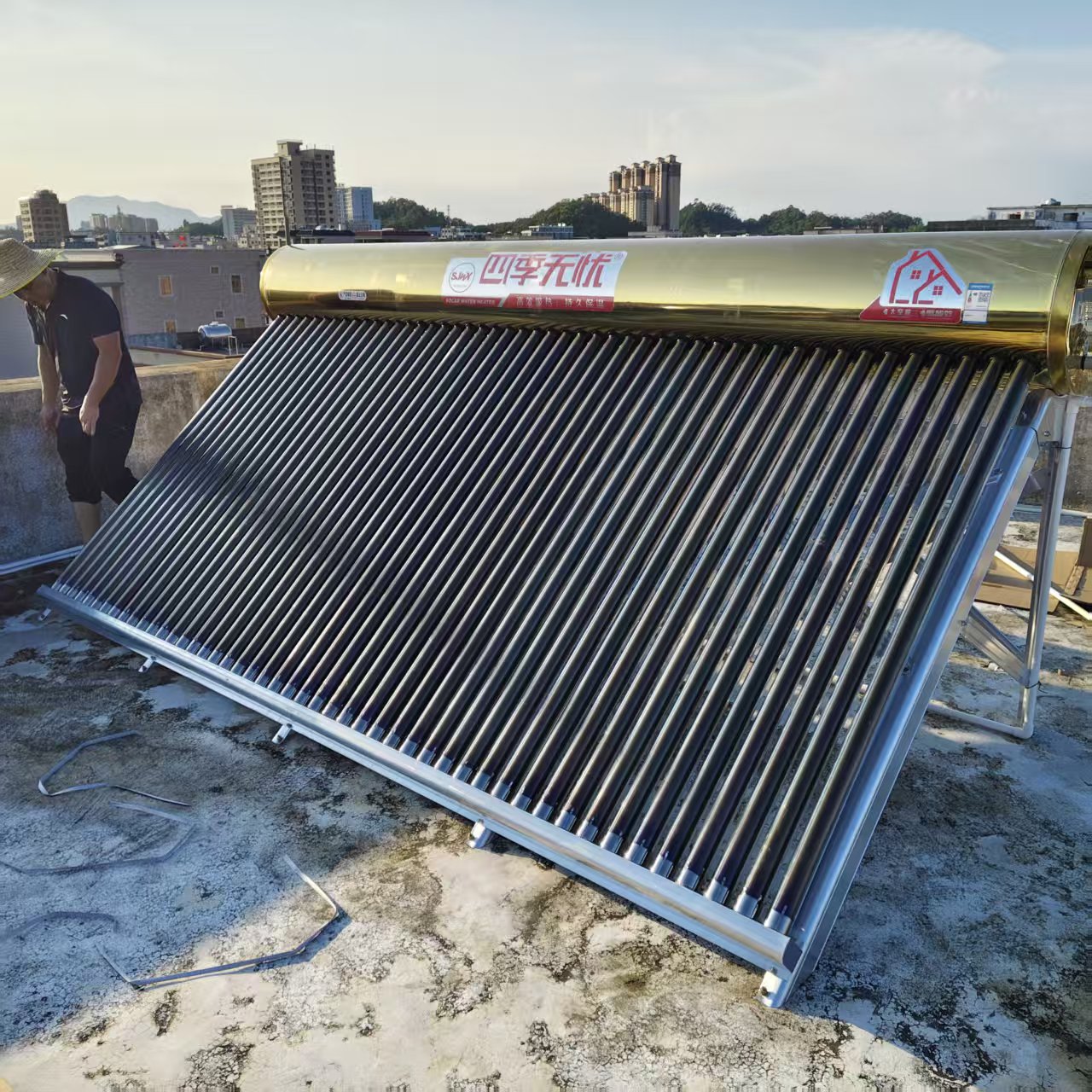 果不其然,第二天清晨,当李先生爬上屋顶查看时,眼前的景象让他欲哭无泪。太阳能热水器的支架已经被大风吹得严重变形,水箱也摇摇欲坠,仿佛下一秒就会掉下去。这还不是最糟糕的,水箱和真空管都出现了不同程度的损坏,完全无法再使用了。李先生无奈地叹了口气,他知道,这台风不仅吹坏了他的太阳能热水器,还吹走了他的好心情和一笔不小的维修费用。