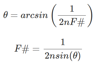 在光学系统描述中,我们常用数值孔径(NA)或F数(F#)来表示光锥的大小。它们之间可以通过阿贝正弦条件相互转换: