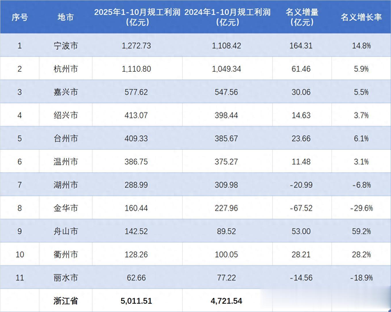 浙江省地处华东,经济发达,工业发展水平稳居全国前列。据统计数据显示,2025年1-10月份,浙江全省规模以上工业企业共实现利润总额5011.51亿元,较上年同期增加289.97亿元,名义增长率为6.1%,整体表现良好。