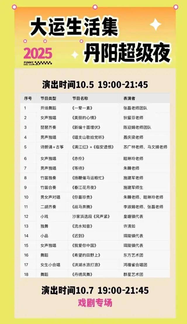 10 月 5 日精品汇演,近20个精品节目轮番登场!市民游客不仅能欣赏到深情款款的男女独唱、合唱,还能沉醉于琵琶与二胡的弦音缭绕、古筝与竹笛的古典对话,更有诗朗诵与小戏、小品等语言类节目增添趣味。10月 7 日更有戏剧专场压轴登场。