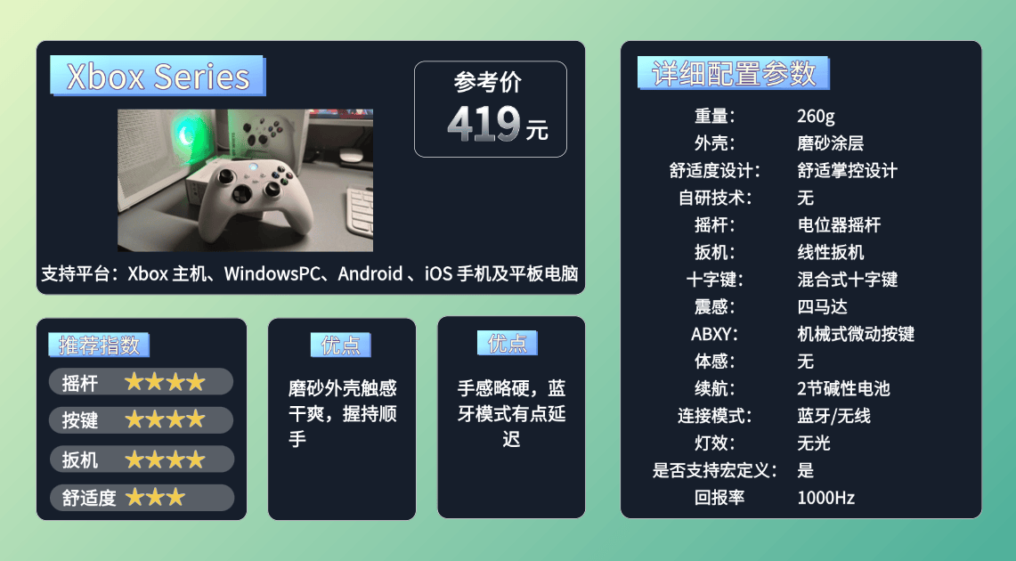 优质产品特点:硬件扎实(如霍尔摇杆/扳机)、功能实用(可编程背键、线性扳机),无多余噱头,性价比高。