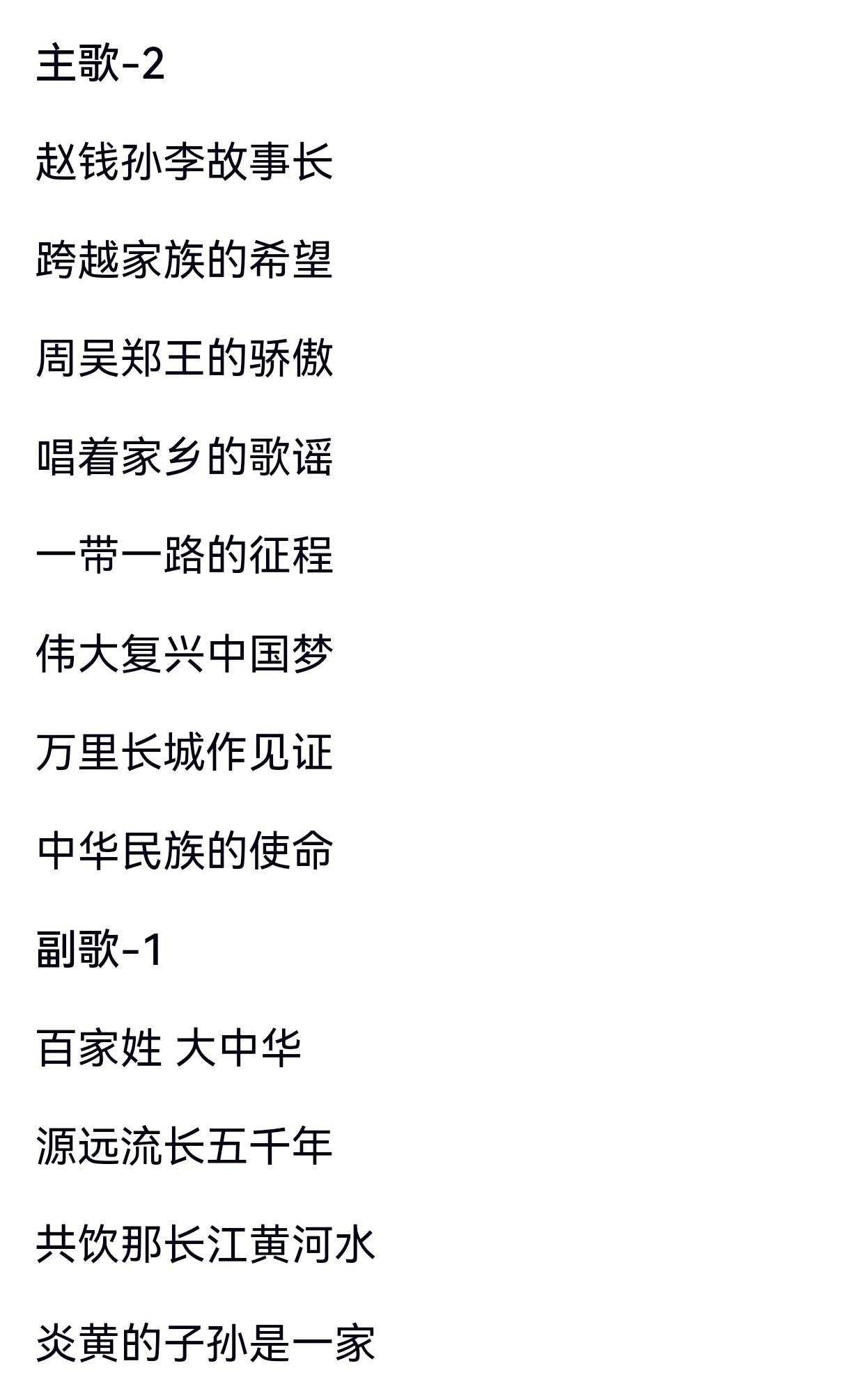 作品采用1=♭B调、4/4拍,速度适中(♩=81),旋律线条清晰流畅。主歌部分节奏平稳,侧重叙事与情感铺垫;副歌及高潮段落(如“百家姓 大中华”段落)音区略有上扬,节奏感更强,满含颂扬与自豪之情,既易于记忆传唱,也契合大众歌曲的传播规律。