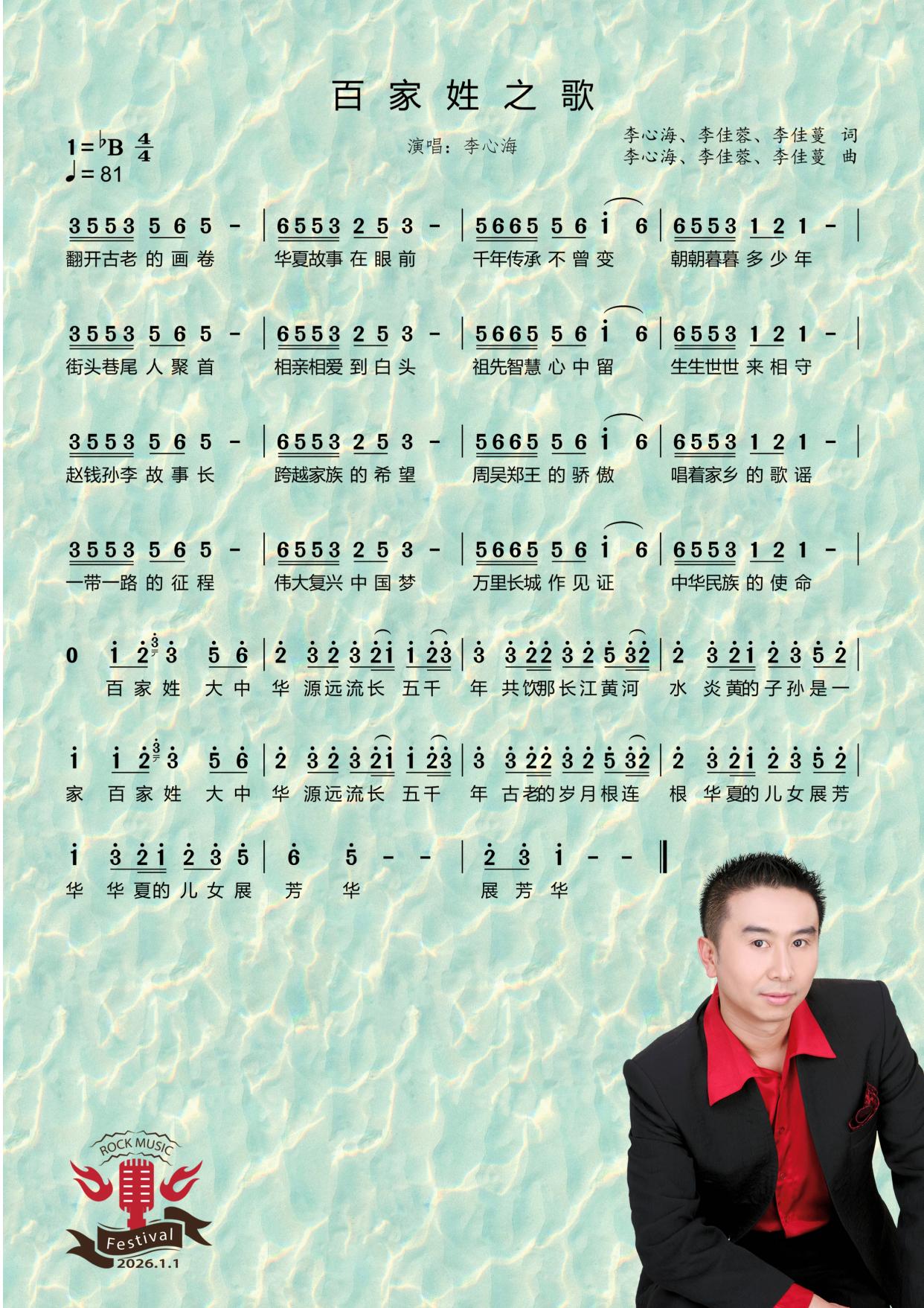 近日,由李心海、李佳蓉、李佳蔓作词作曲,李心海编曲并演唱的主题歌曲《百家姓之歌》正式发布。这首作品凭借独特的艺术构思,成功将姓氏文化升华为宏大的家国叙事,在同类题材作品中独树一帜。
