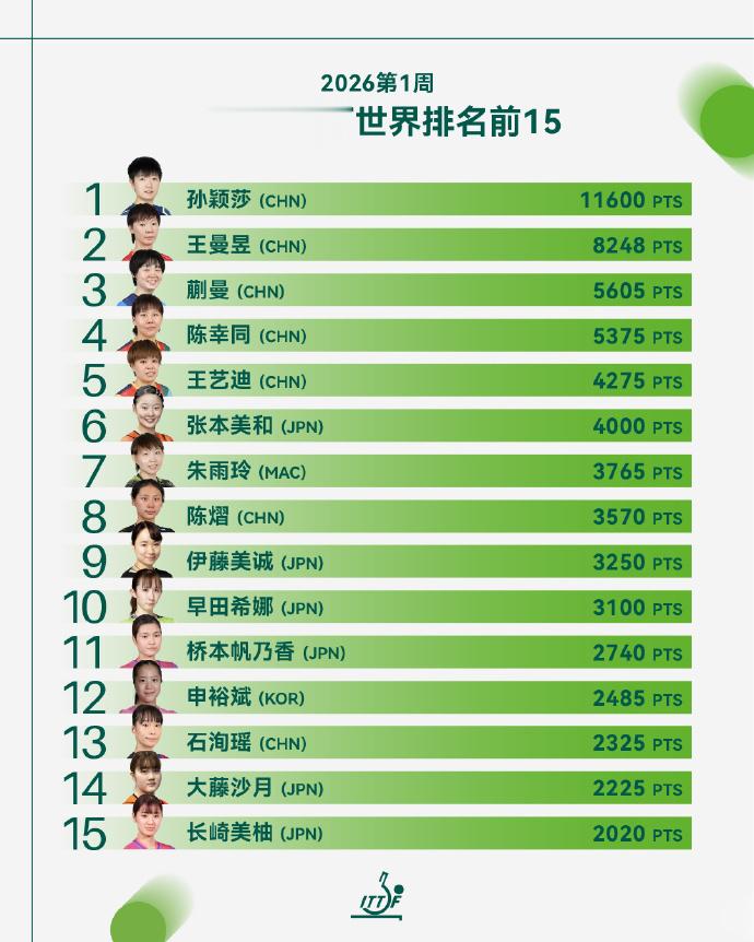 女子单打方面,孙颖莎、王曼昱、蒯曼、陈幸同、王艺迪五位中国女将高居前五位,另一位中国小将陈熠排在第八。前十位的其他球员分别是:张本美和、朱雨玲、伊藤美诚、早田希娜。
