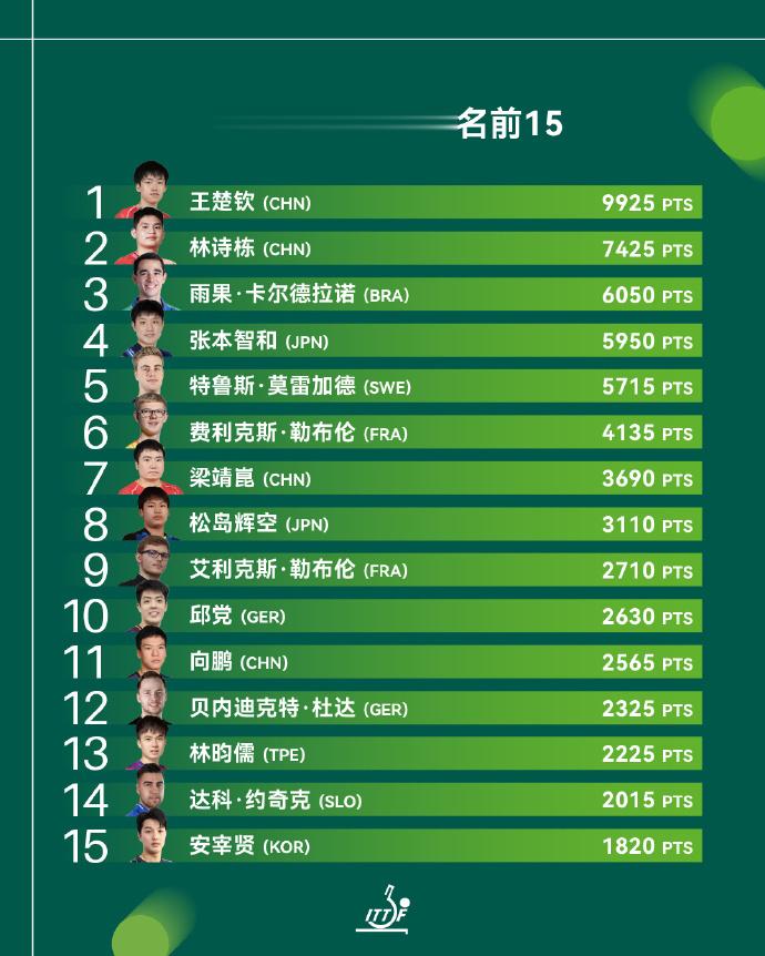 排在第三位的是今年世界杯冠军巴西名将雨果-卡尔德拉诺,日本选手张本智和排在第四,瑞典名将莫雷加德排在第五。接下来第六到第十分别是小勒布伦、梁靖崑、松岛辉空、大勒布伦、邱党。