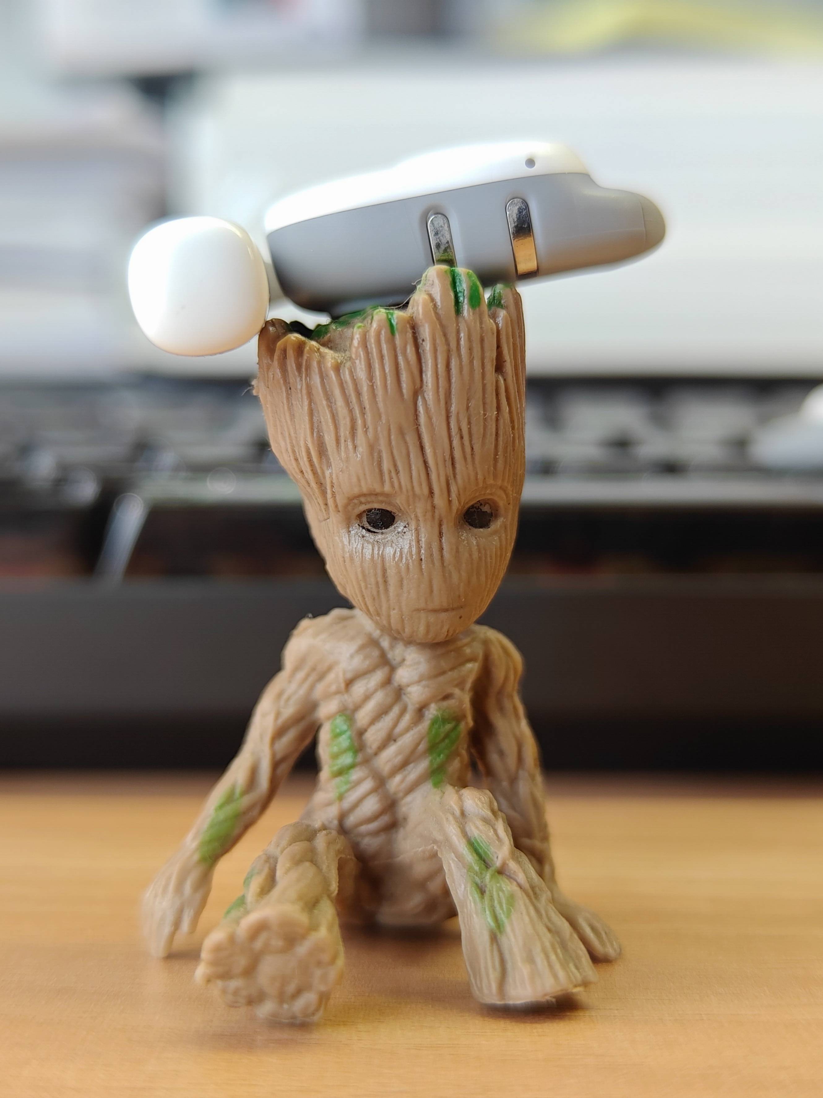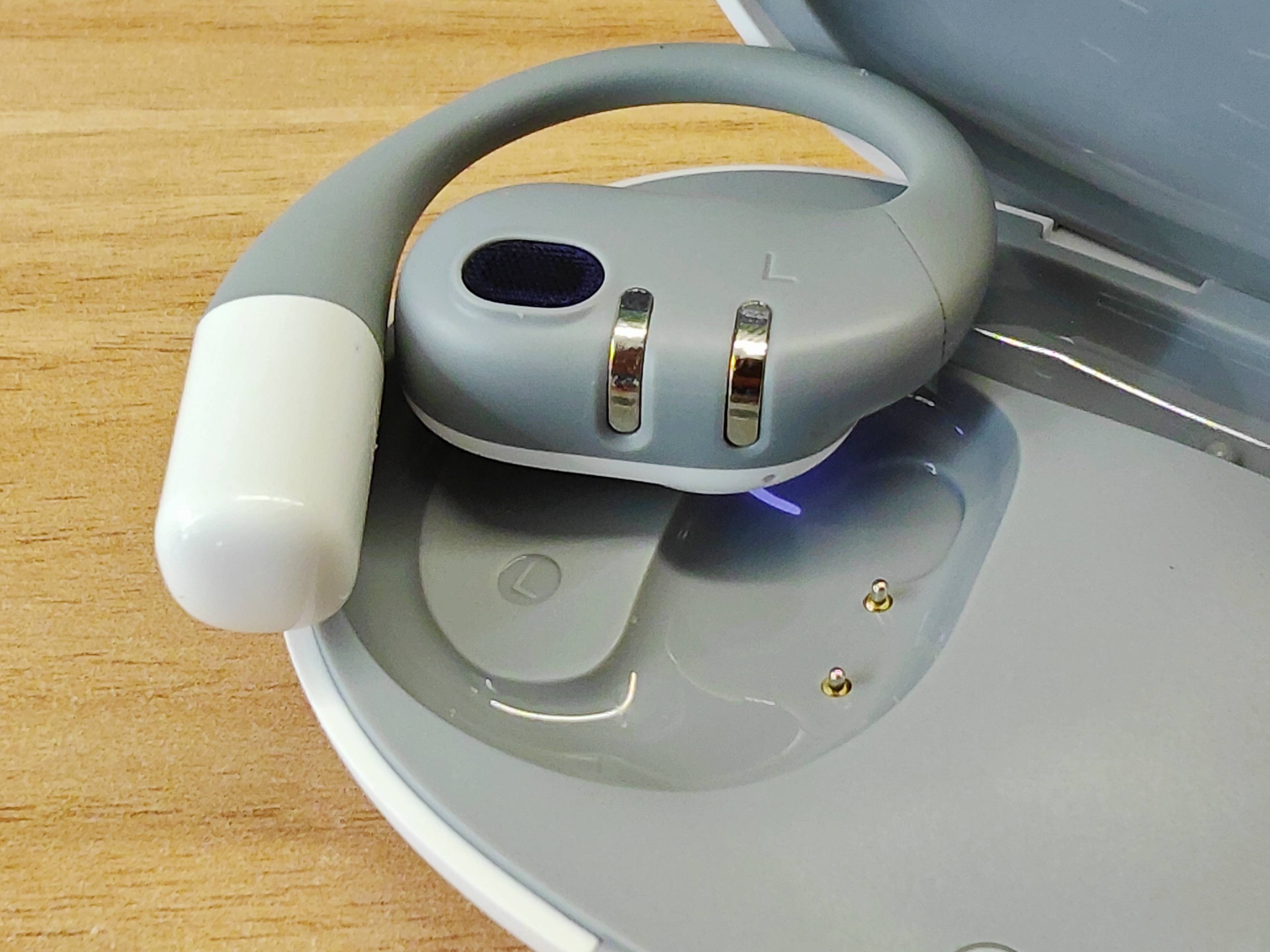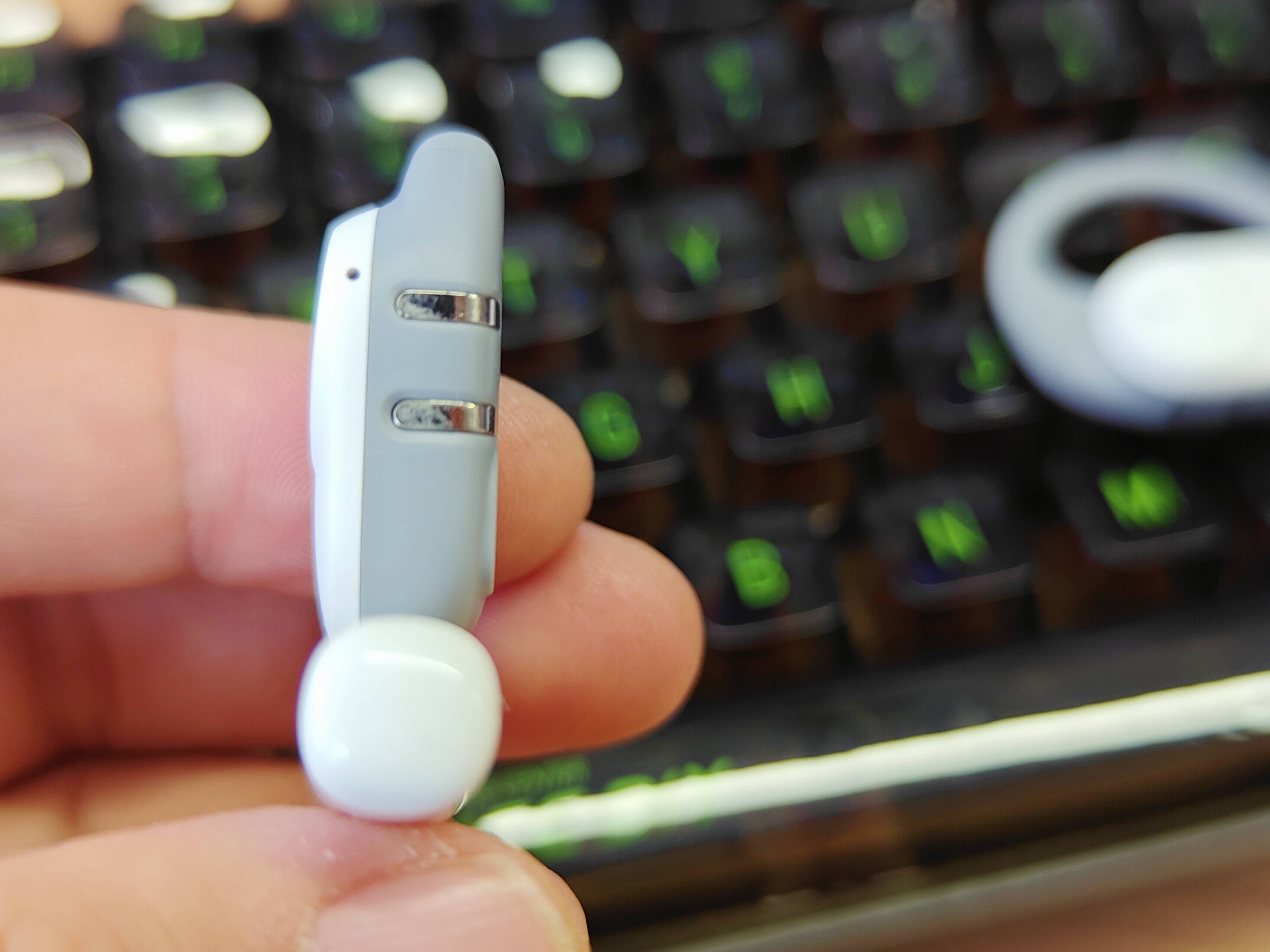 打开上盖,接缝处的指示灯调亮起,耳机本体用的是亲肤液态硅胶材质,触感温润,单耳仅8g重,戴在耳朵上基本没存在感。而且对于我这种眼镜用户也不很友好,流线型工学设计完美贴合耳廓,耳挂和眼镜腿互不干扰,连续戴6小时办公都不会觉得压迫。