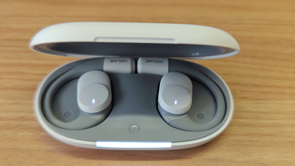 打开外包装后,使用指南下就是耳机本体,旁边是配件盒。HOLME Ultra的充电盒外形简约,扁平椭圆形,开合处有信号指示灯条。