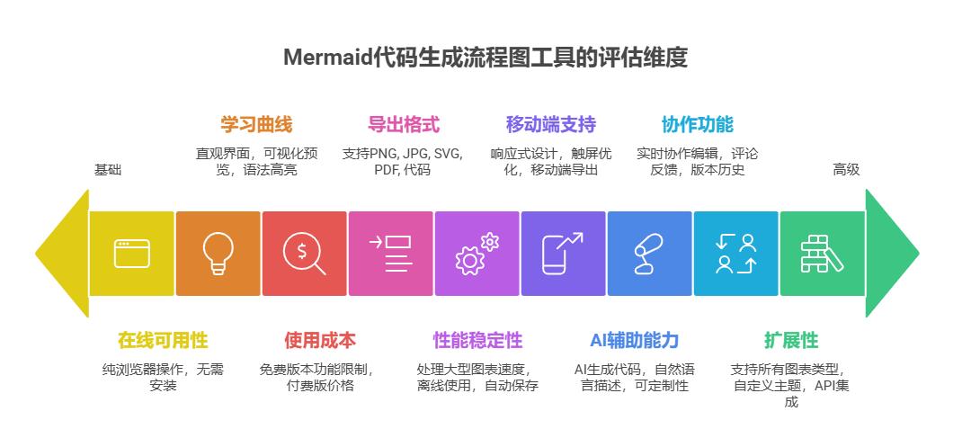 怎么用Mermaid代码在线生成流程图?选择一款合适的Mermaid代码在线生成工具,需要从多个维度进行综合评估,在选择Mermaid代码绘图工具时,可按下边经过实践验证的维度进行筛选: