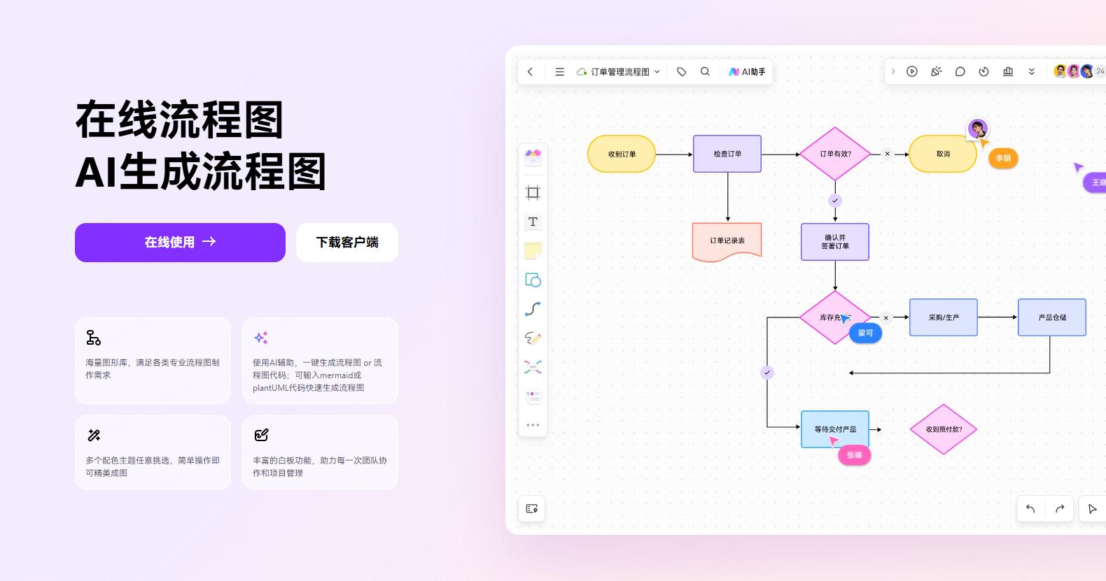 目标用户 产品经理在需求评审会上即时绘制业务流程,研发团队进行技术方案讨论时快速可视化架构,设计师整理用户旅程时生成交互流程,远程团队进行头脑风暴时同步创作。