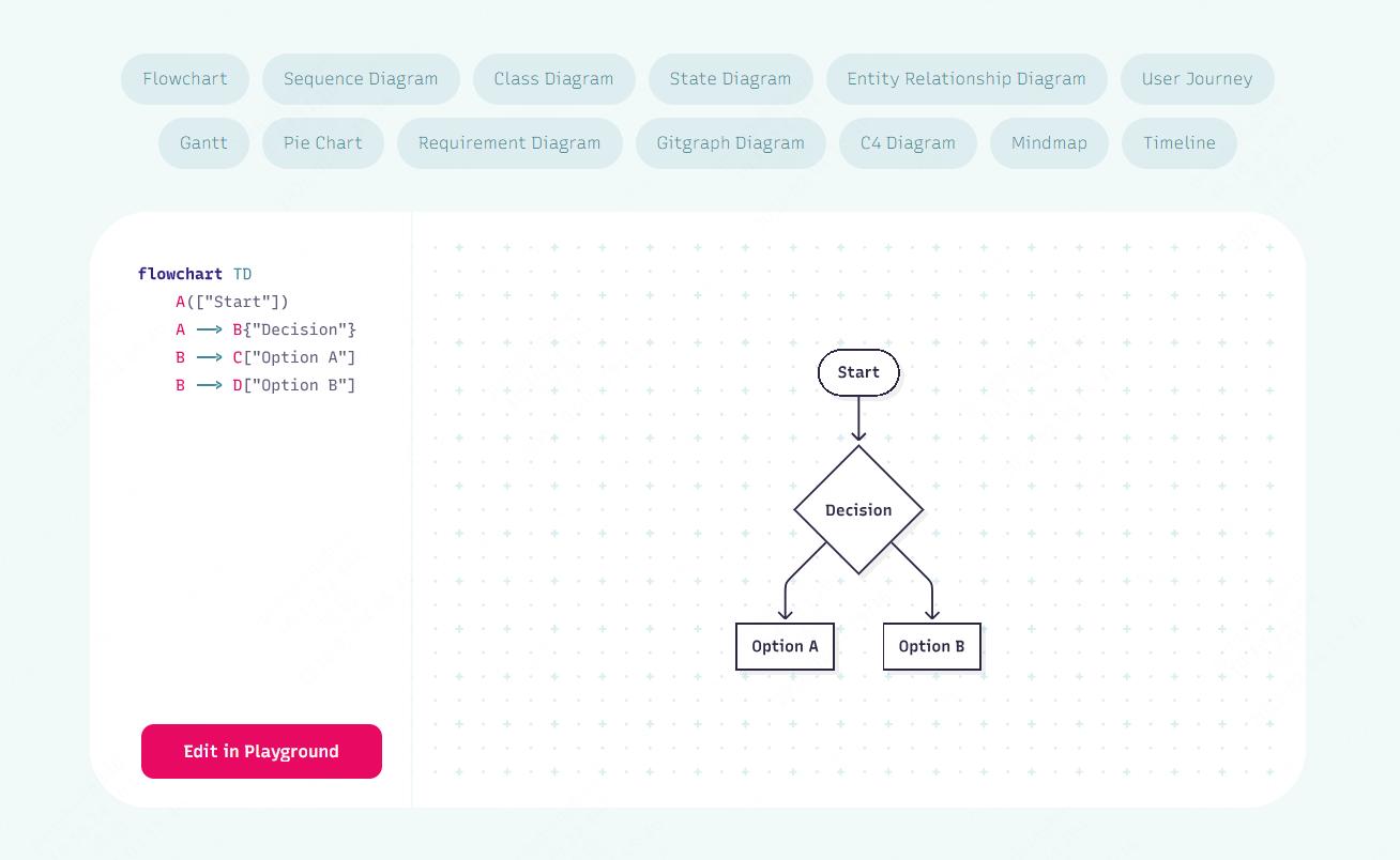基于Mermaid能绘制的图表种类相当丰富:流程图(Flowchart)、时序图(Sequence Diagram)、甘特图(Gantt Chart)、类图(Class Diagram)、状态图(State Diagram)、ER图(Entity Relationship Diagram)、用户旅程图(User Journey)等等,加起来有十几种。正因为类型这么全,从产品设计到技术开发的各个场景,Mermaid基本都能派上用场。