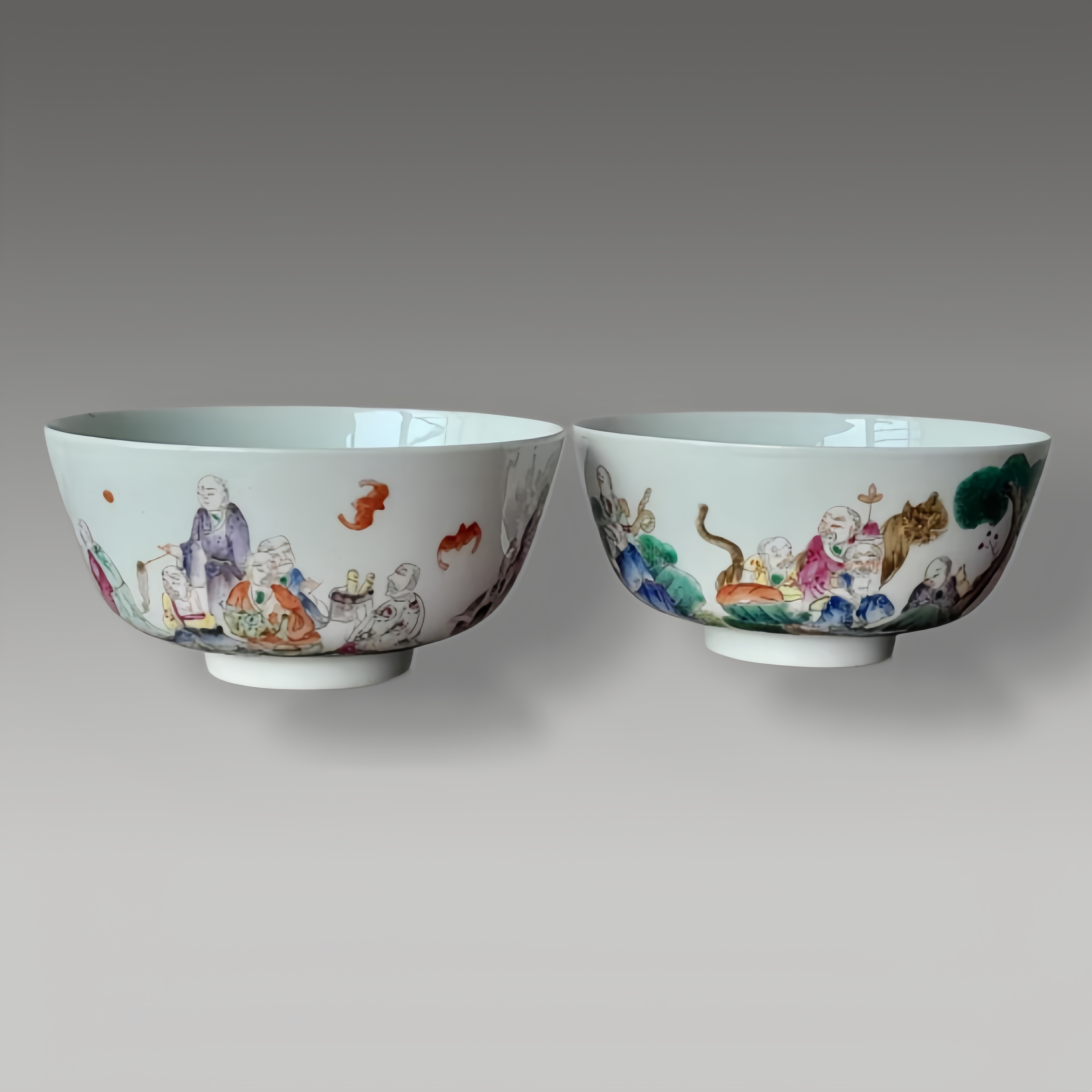 粉彩设色明丽,罗汉神态各异,蝠纹添福,胎质细腻,成对传世,尽显清代粉彩瓷的华贵与吉祥