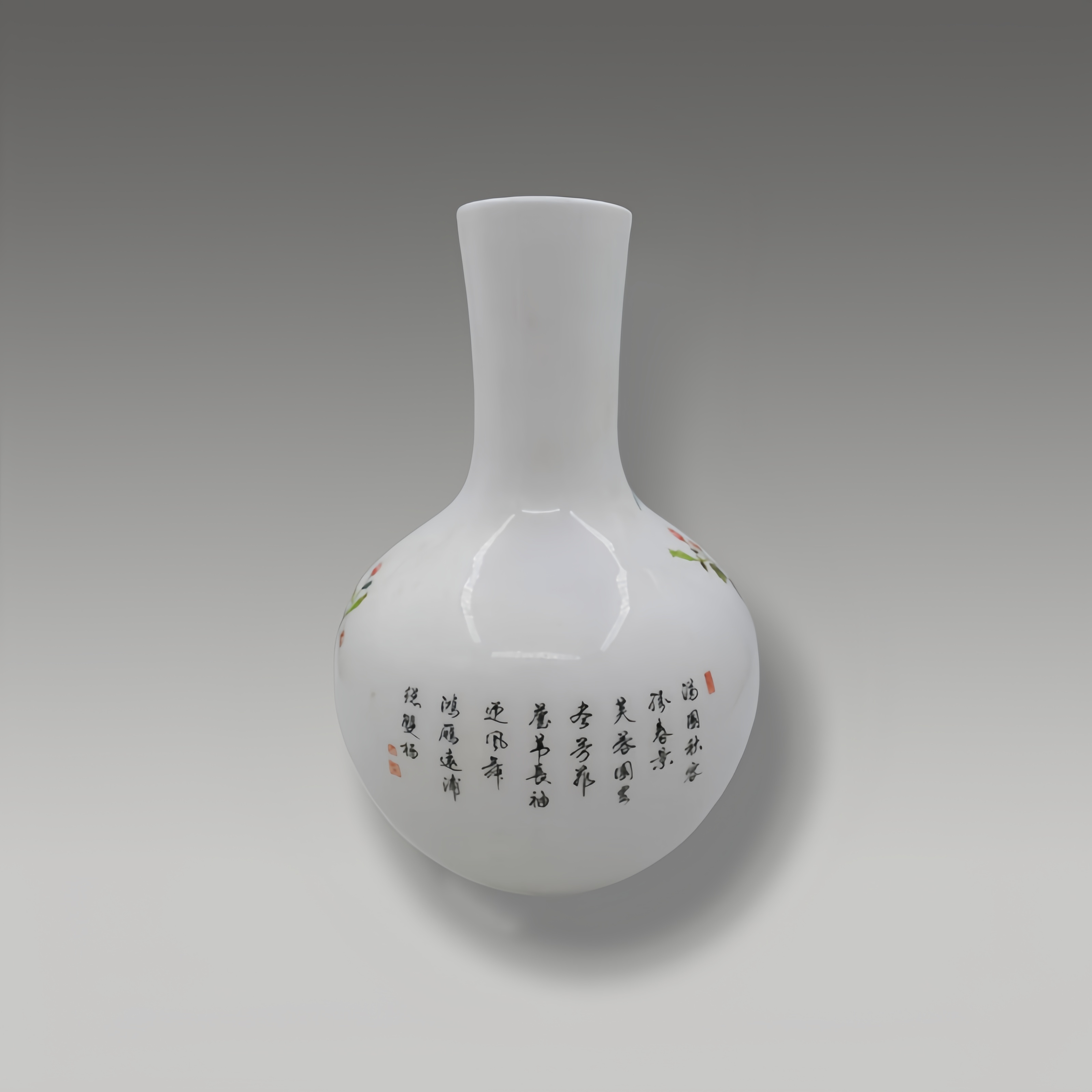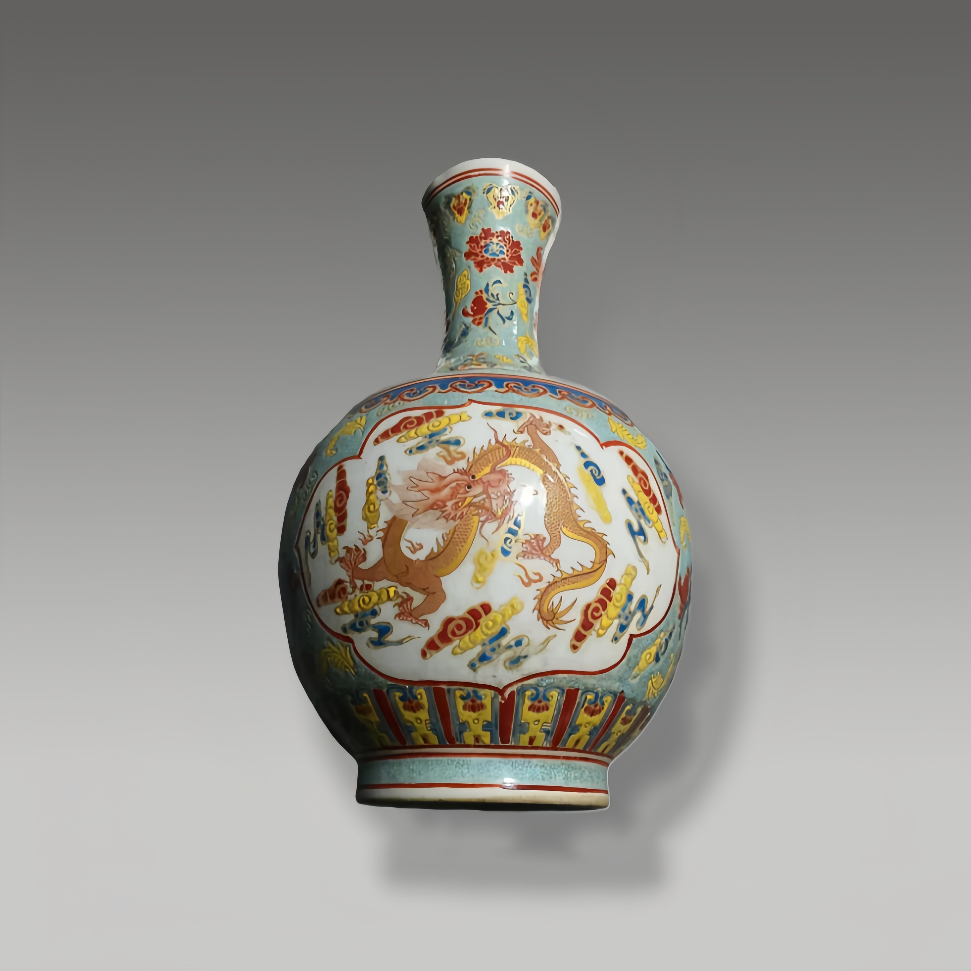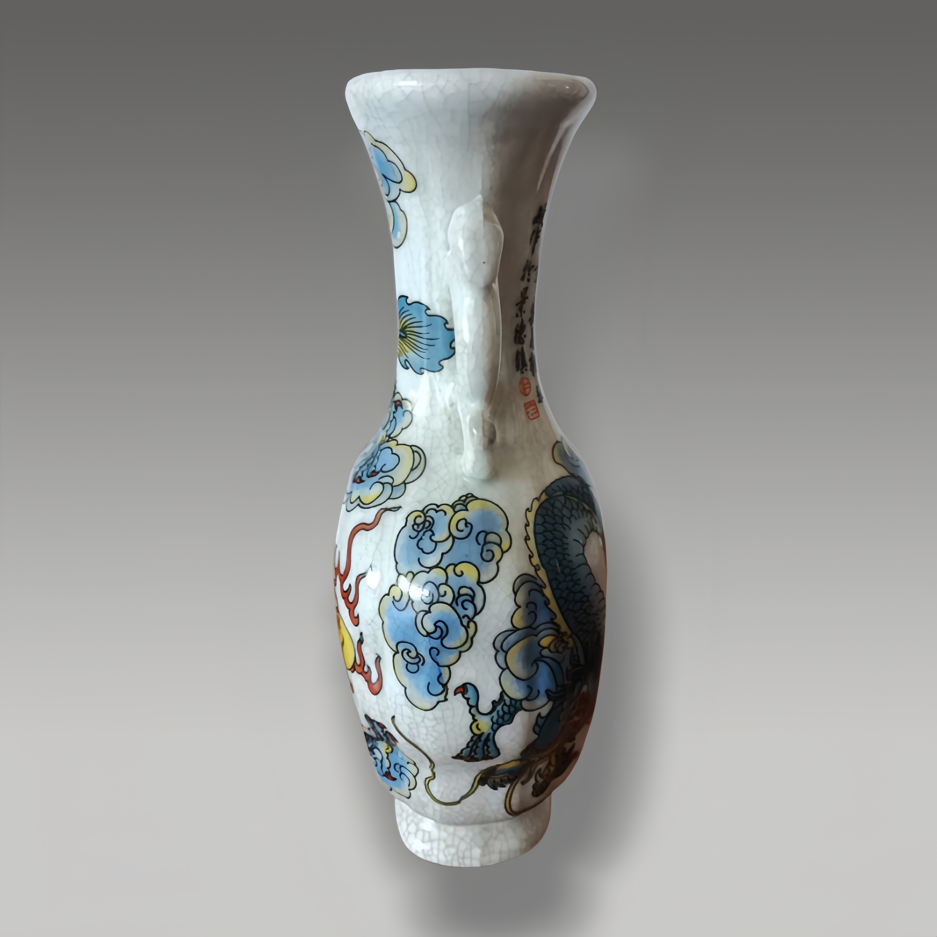 这只彩龙戏珠瓷瓶,开片细腻,龙纹矫健,青花与粉彩交映,题字风雅,尽显东方古韵与匠人心血