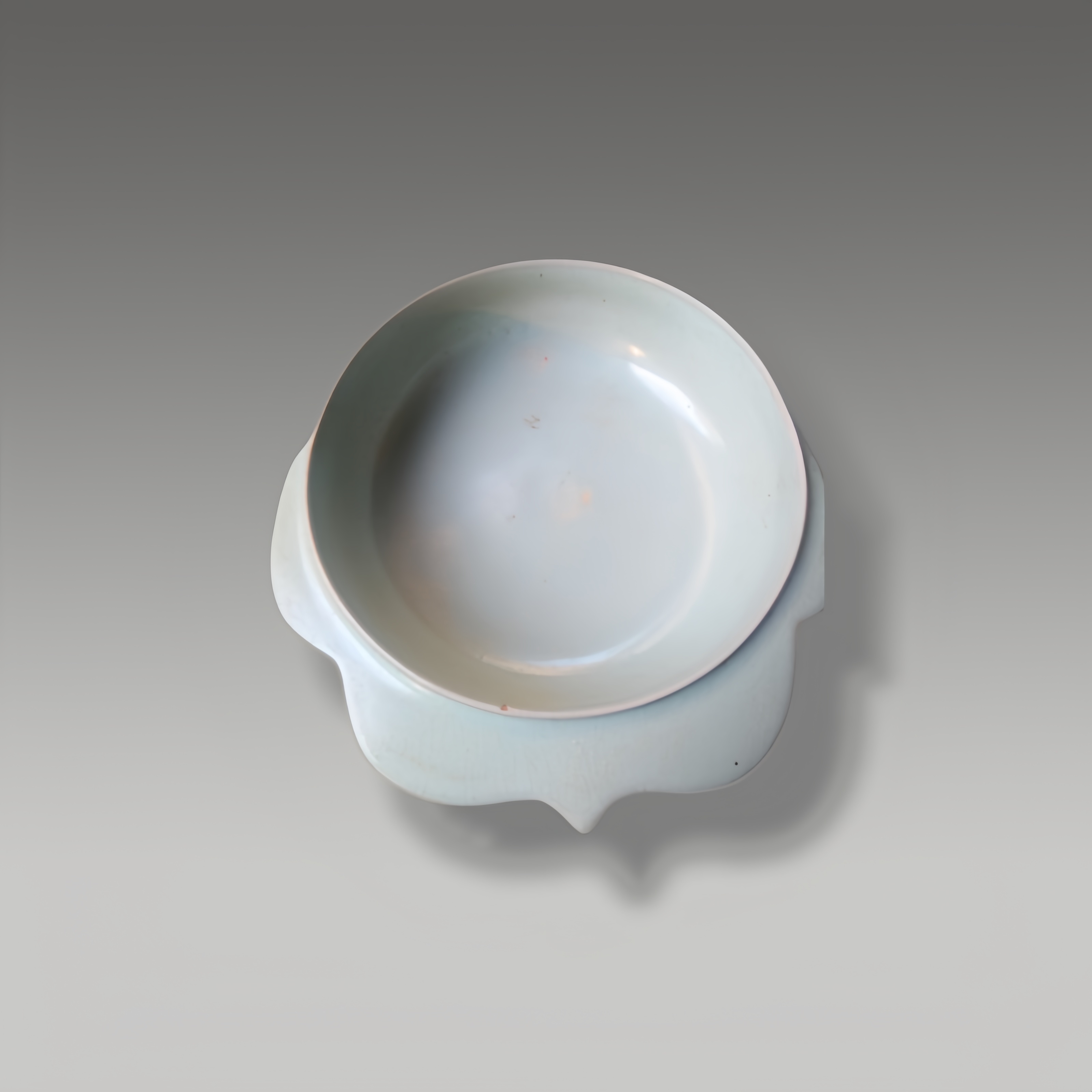 天青釉色温润如玉,开片细密如丝,花口造型灵动雅致,支钉烧痕尽显古意,是宋瓷韵味与匠心工艺的珍贵遗存