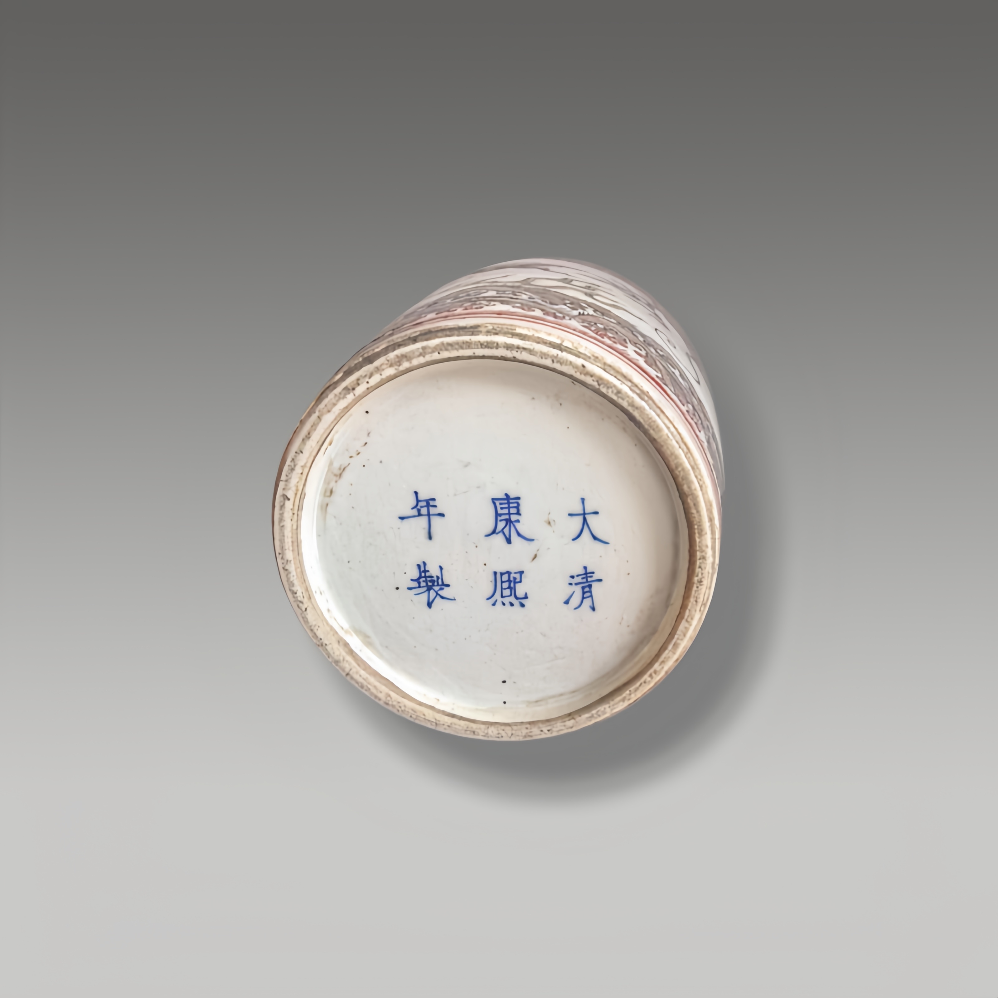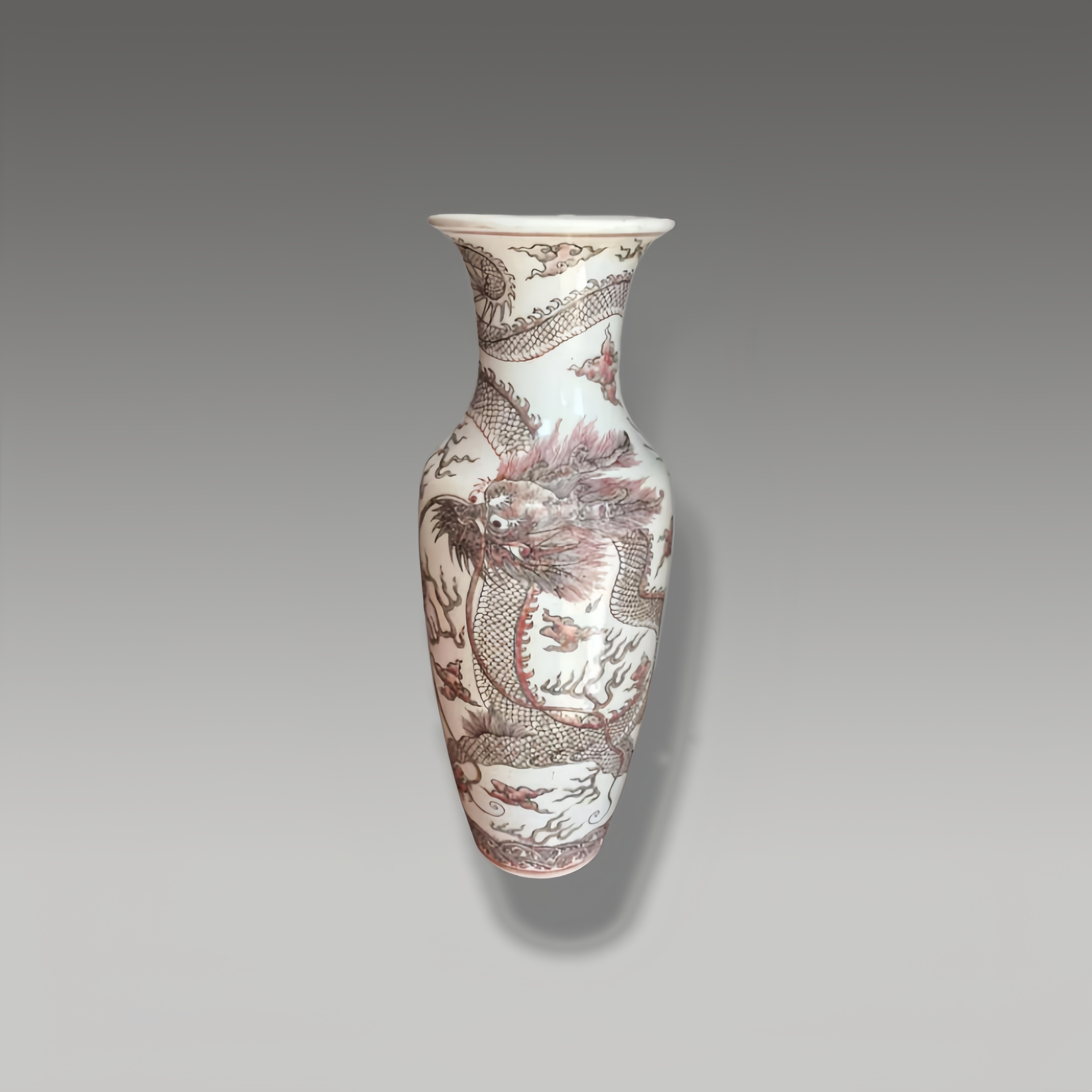 这件矾红彩龙纹观音瓶,器形修长典雅,白釉温润。瓶身以矾红绘矫健苍龙,鳞爪分明,云纹火焰灵动飘逸