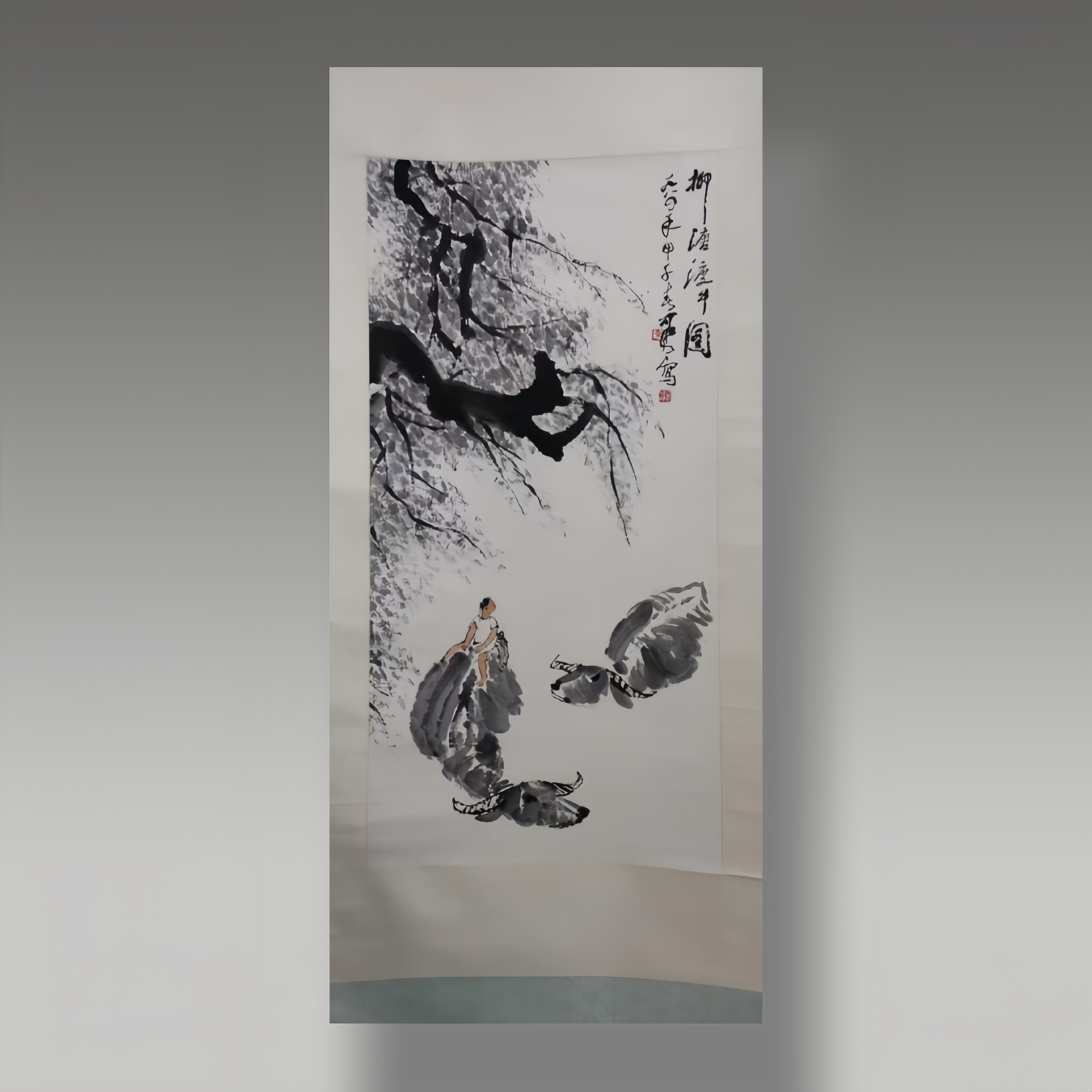 牧牛渡水,恬淡悠然,墨色浑厚温润,柳影波光意境清幽。可染笔意质朴传神,田园雅趣,极具艺术与收藏价值