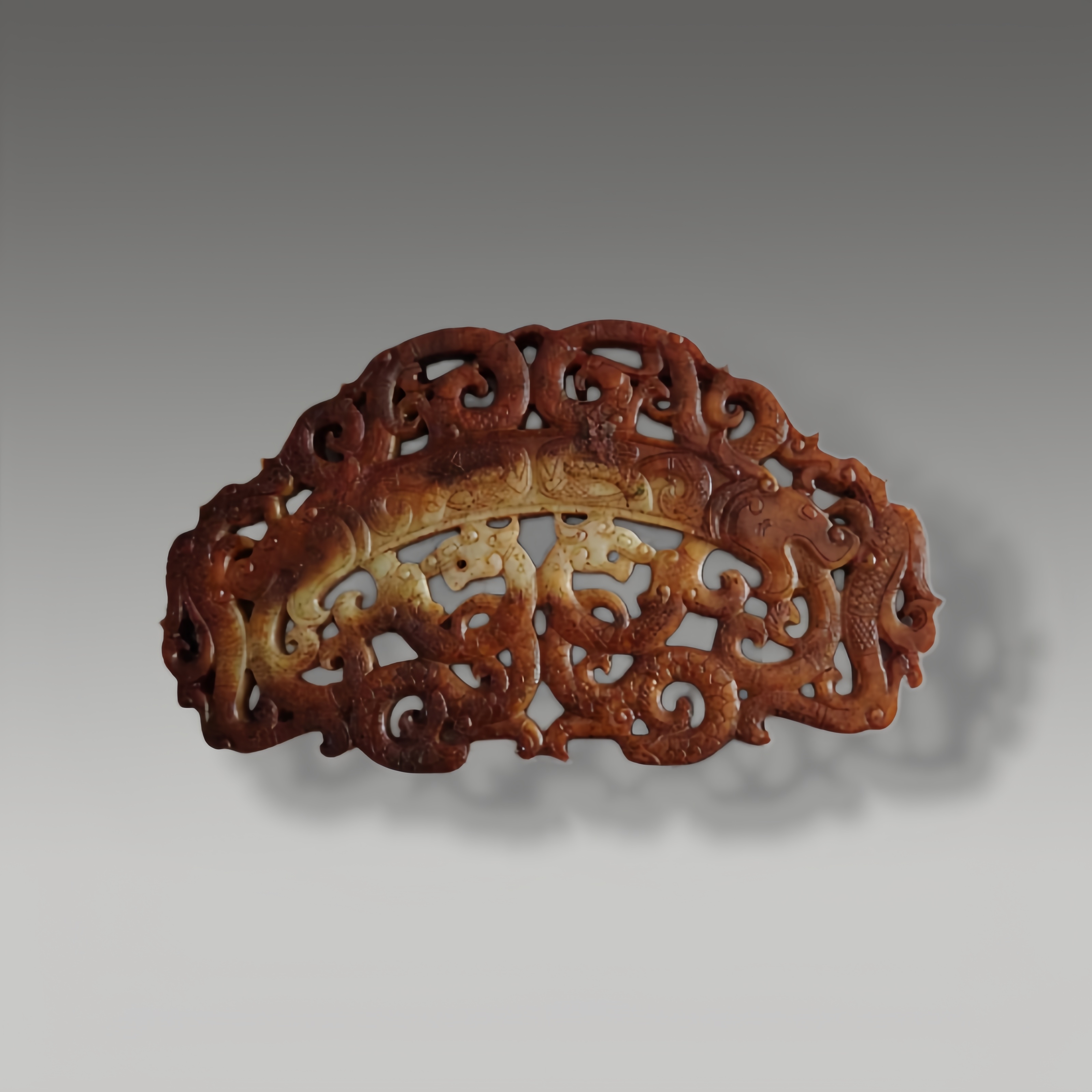 此玉璜雕工精湛,透雕龙凤灵动翩跹,沁色古朴厚重,尽显战汉风骨,纳祥瑞之气,藏千年匠心