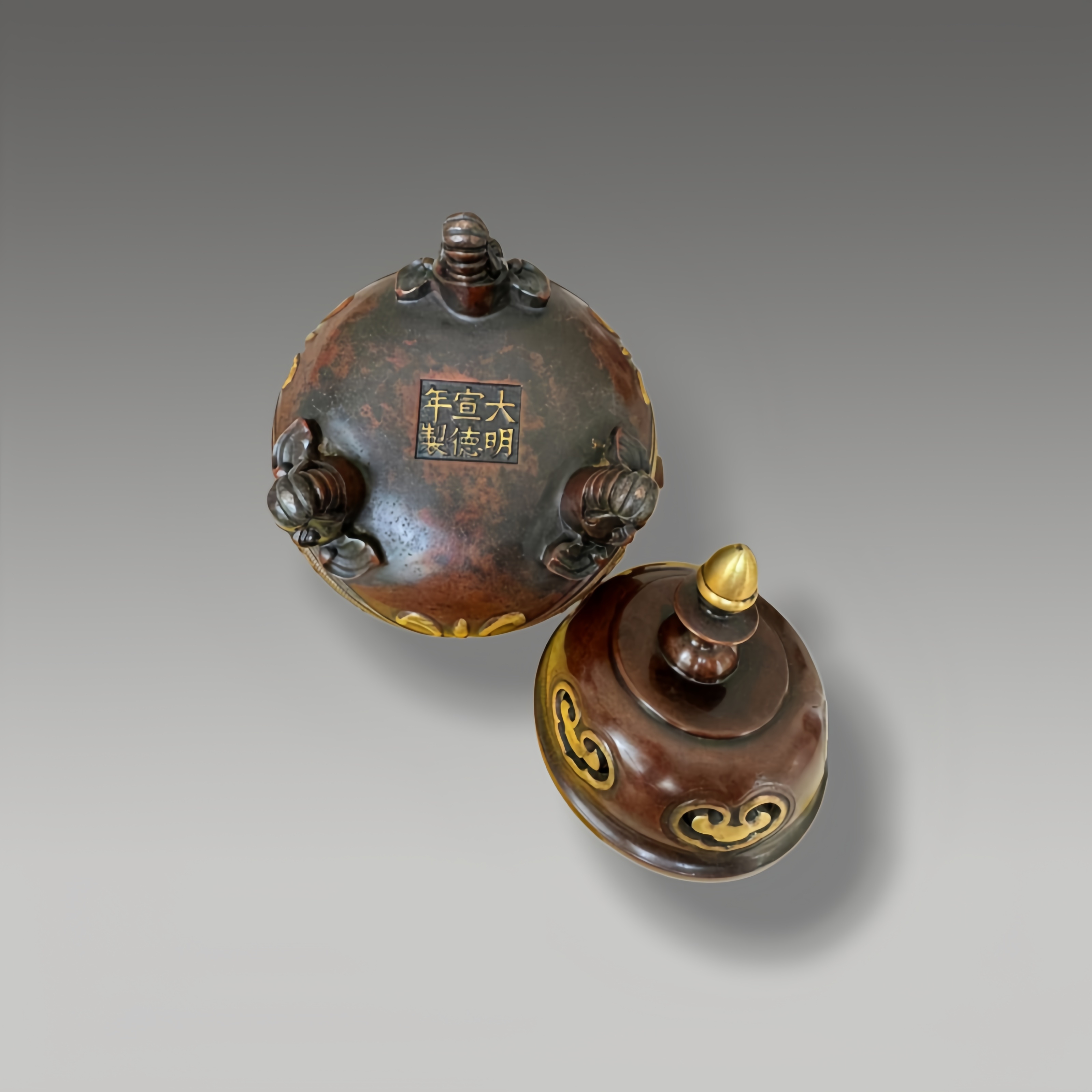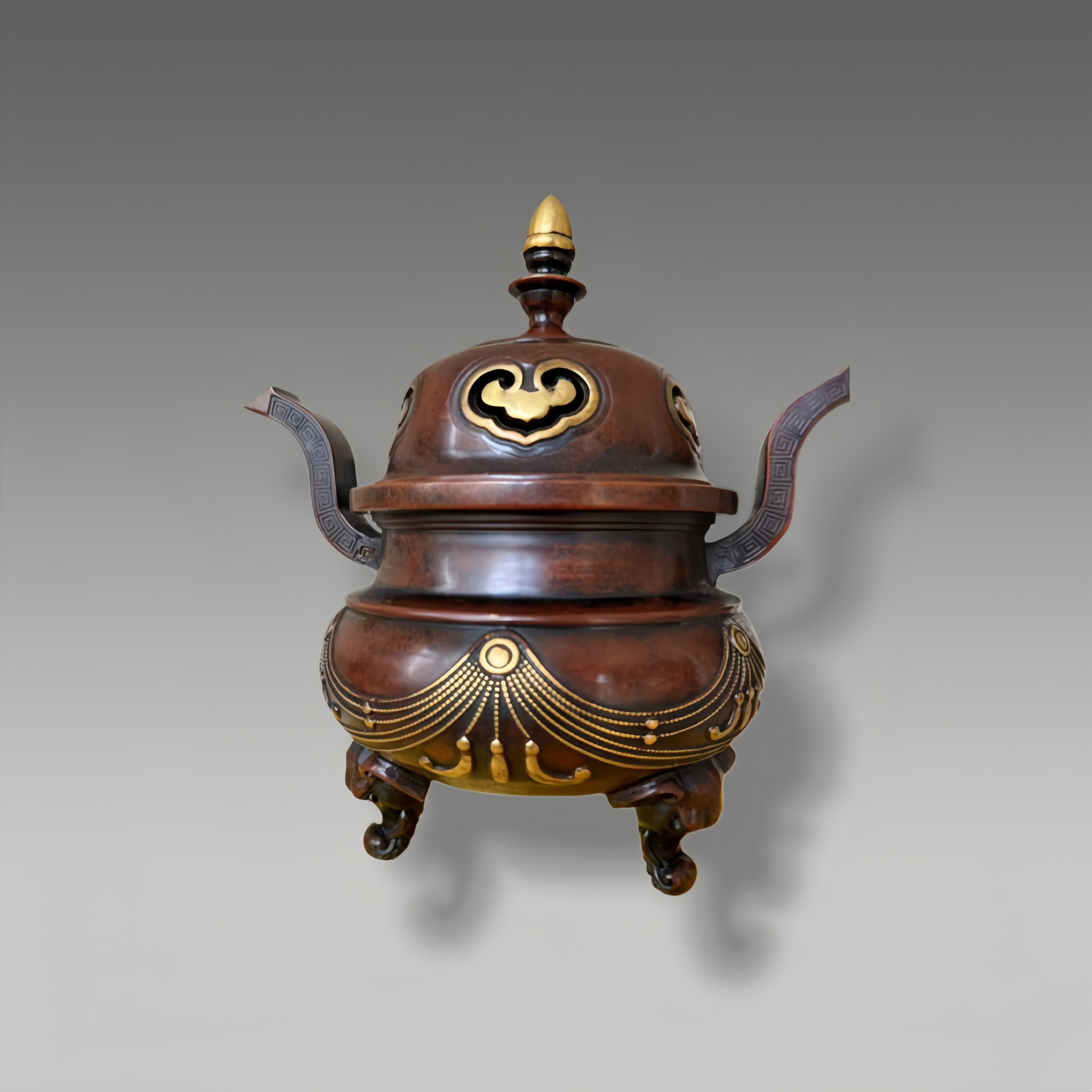 此炉铜质温润,鎏金璀璨,象足稳健,纹饰繁复精美,盖钮玲珑,焚香时烟缕袅袅,尽显古雅庄重与匠人之巧