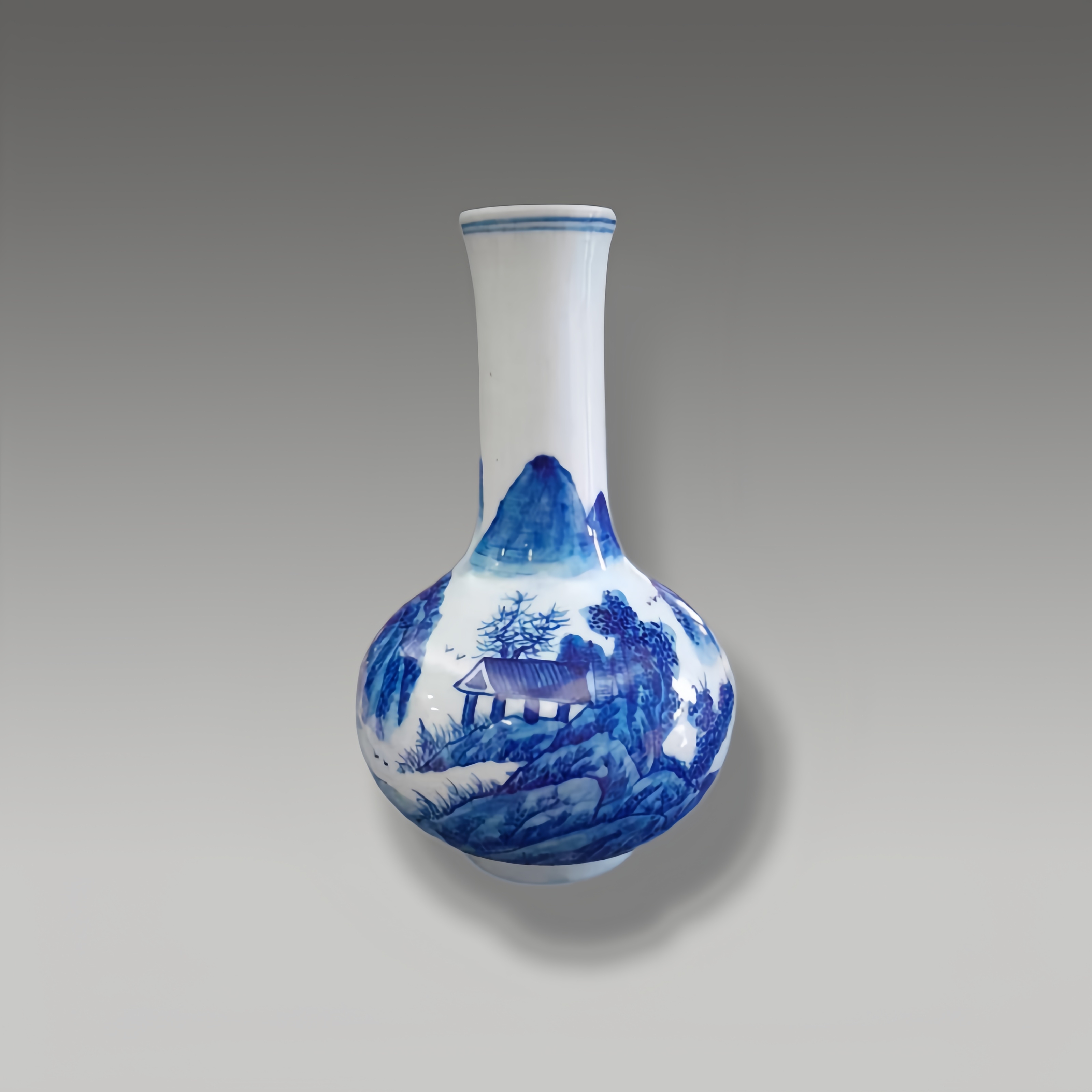 青花晕染山水,层峦叠翠间茅舍隐现,釉色莹润,笔意清雅,尽显清代瓷画的诗意与匠艺