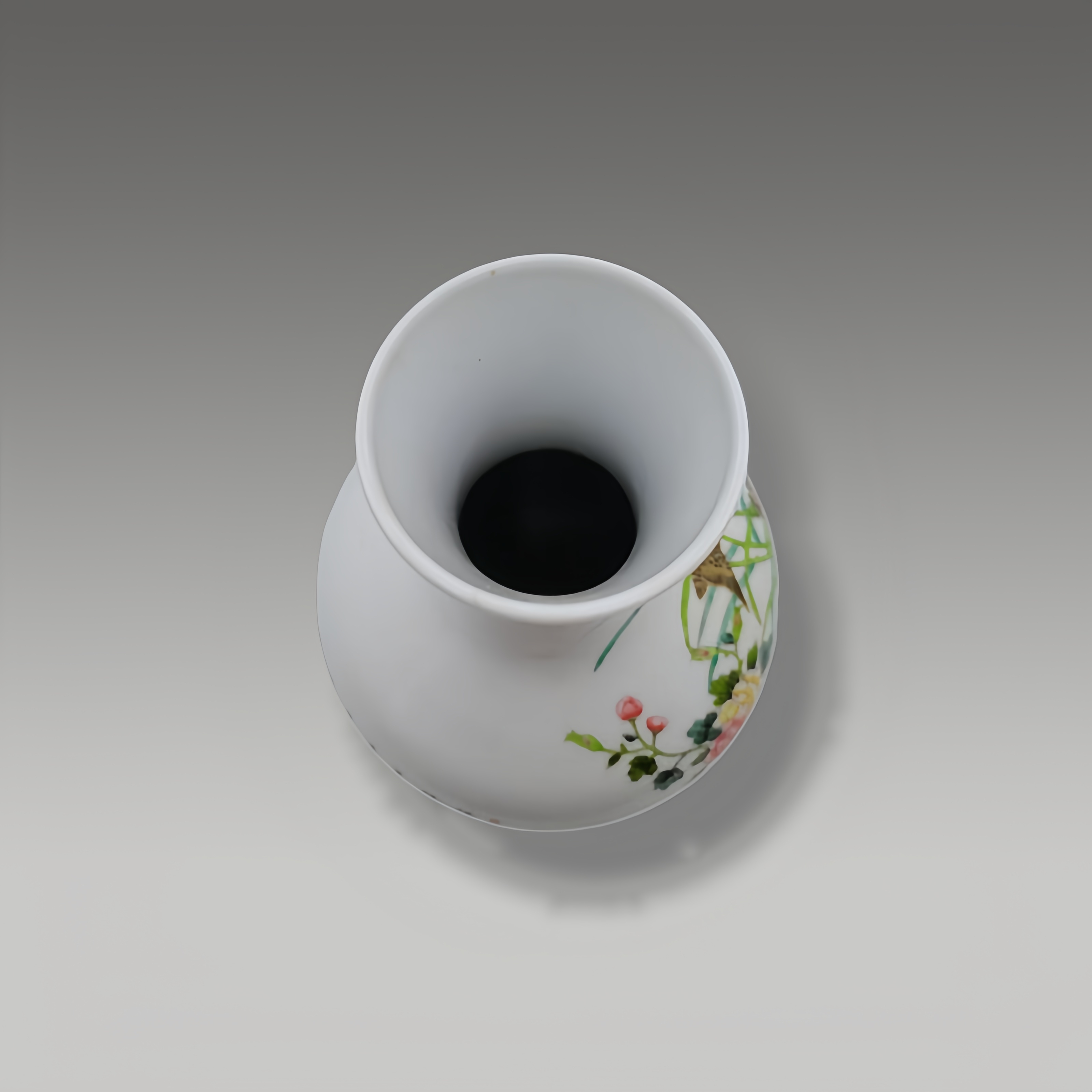 此瓶胎质莹白如玉,粉彩设色鲜妍雅致,芦雁振翅欲飞、牡丹盛放含娇,湖石芦苇相映成趣