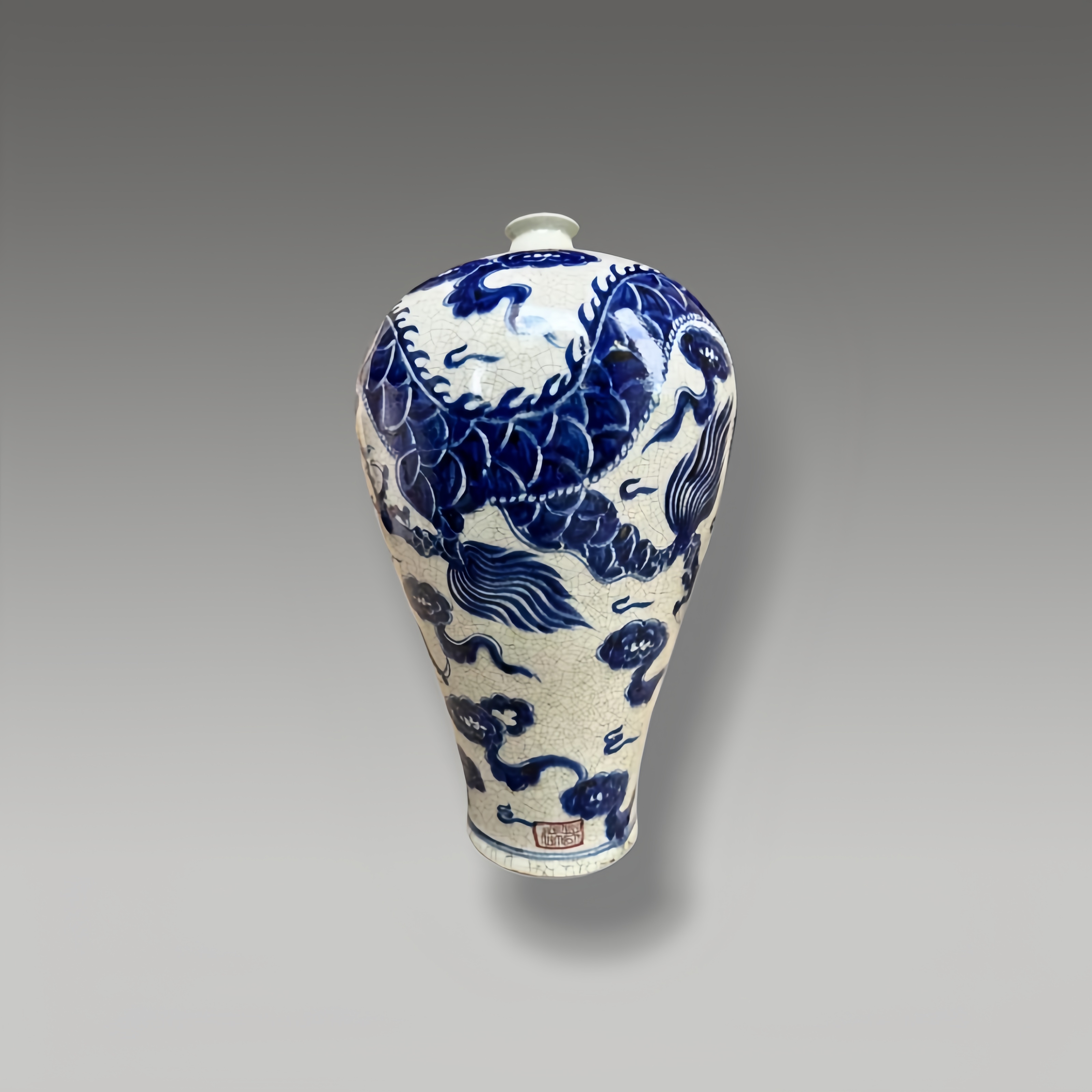 此瓶釉色莹润,开片自然,青花浓艳苍劲,龙纹矫健灵动,云纹飘逸,尽显雄浑大气,是青花瓷器中的雄浑佳作
