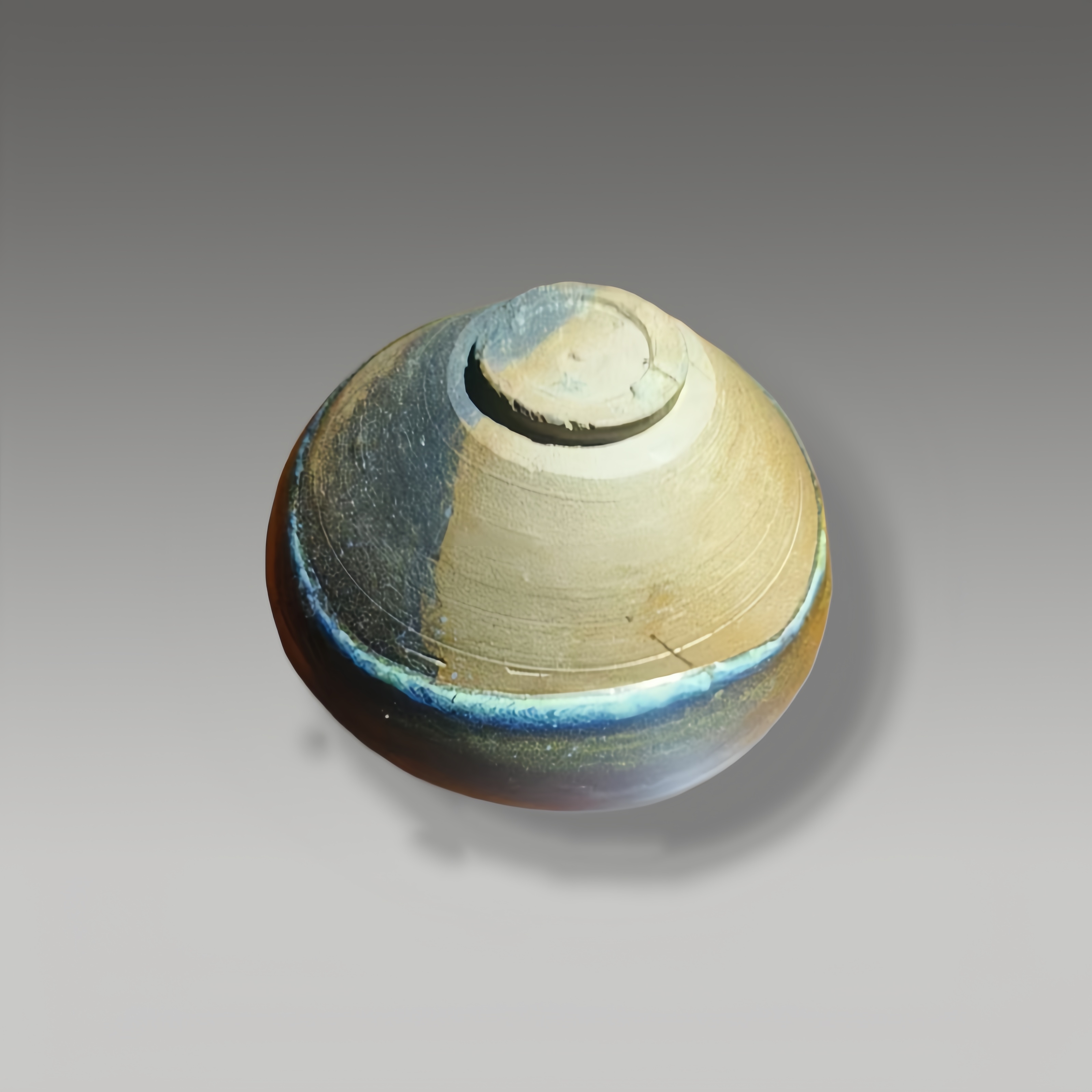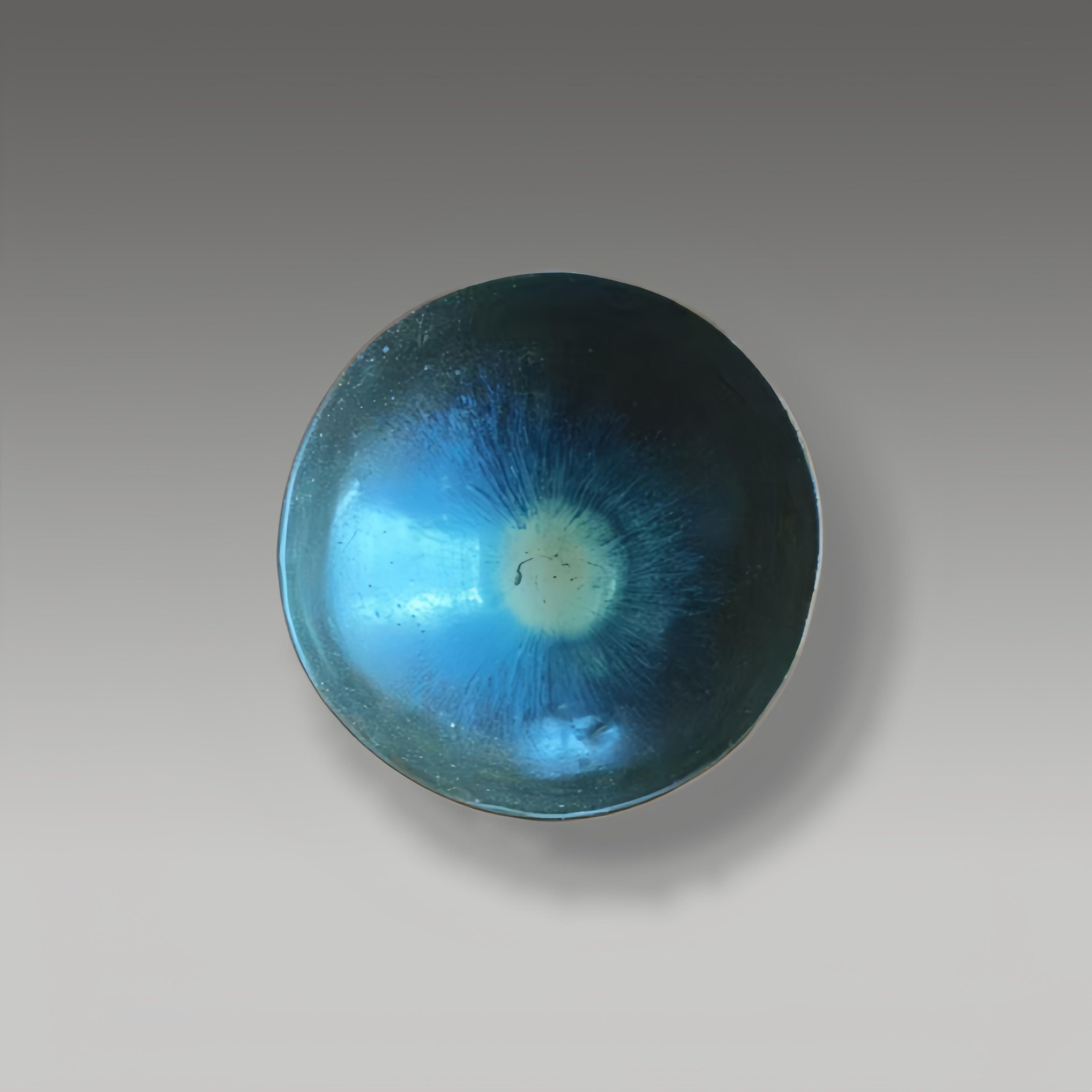 盏内釉色以天青为底,向盏心放射出细密的蓝色毫纹,釉面温润莹亮,外部釉色过渡自然