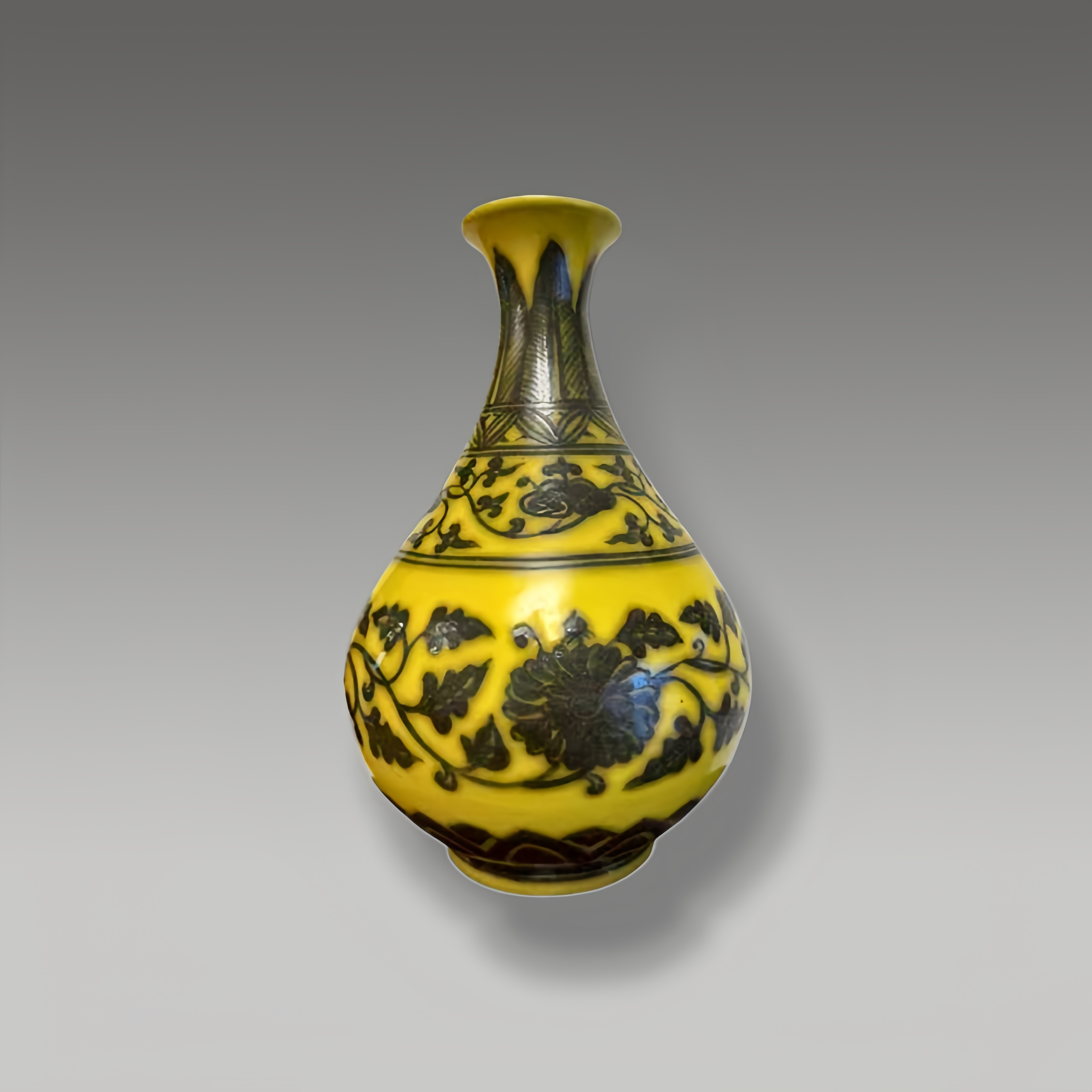 此瓶黄釉明艳温润,墨彩纹饰典雅工致,缠枝花卉栩栩如生,器型秀雅,尽显明代宫廷瓷的华贵与雅致