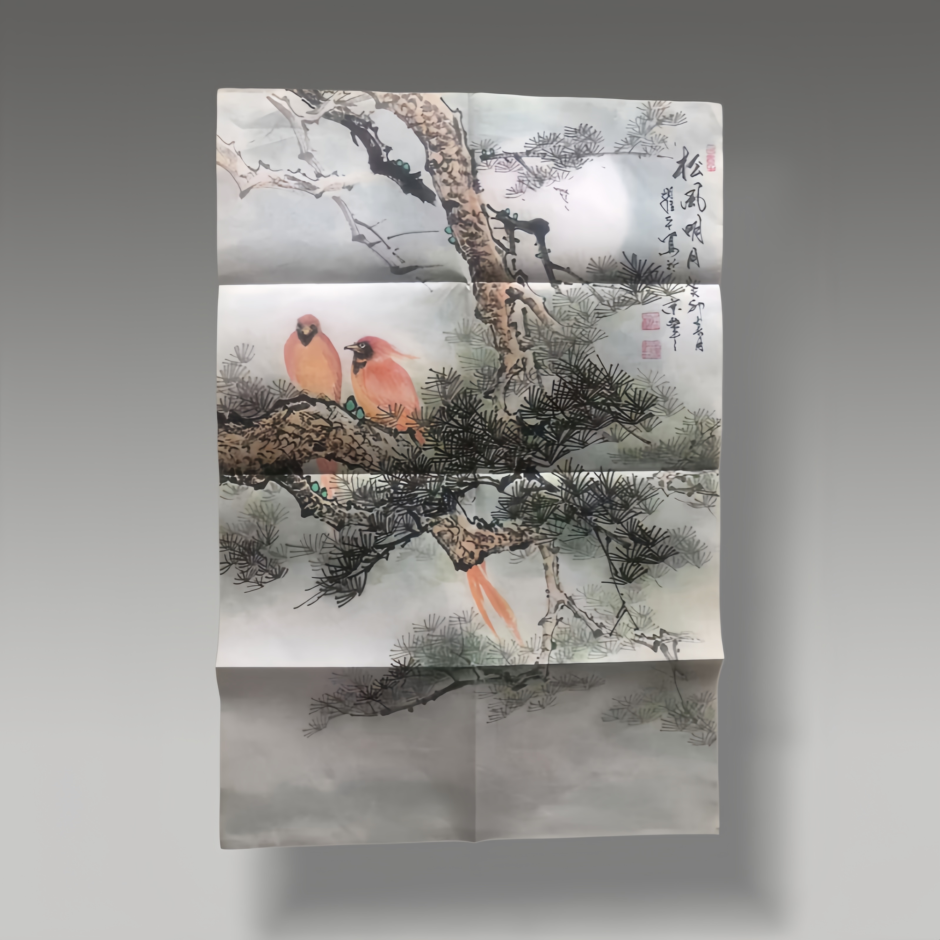 苍松虬枝盘曲,墨针苍劲如铁,明月清辉漫洒,晕染出朦胧诗意。两只朱羽灵禽相依栖枝,橙红羽色暖而不俗