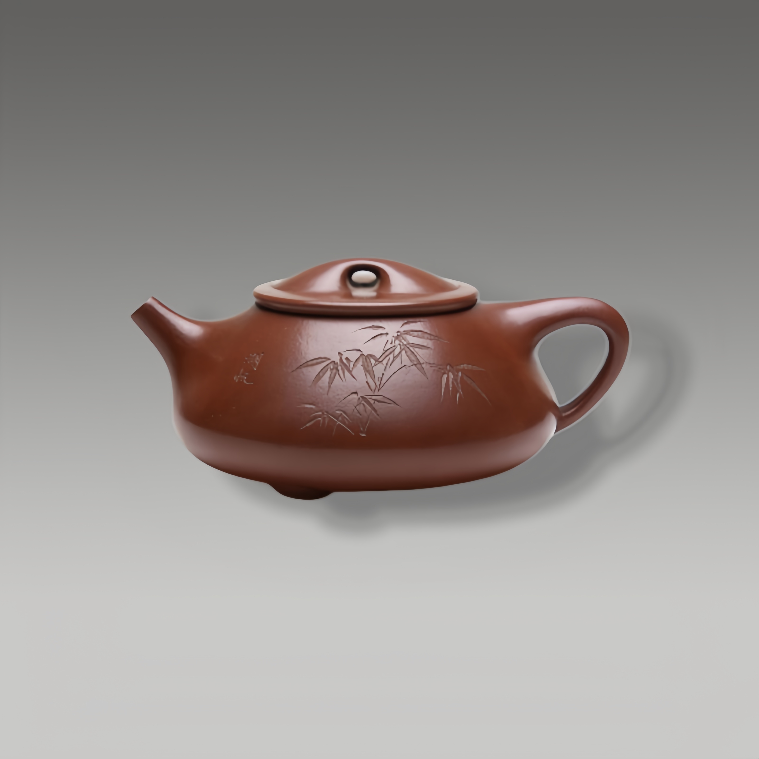 这把景舟石瓢紫砂壶,泥料温润呈褐红,器形饱满稳重,桥钮与壶流比例协调