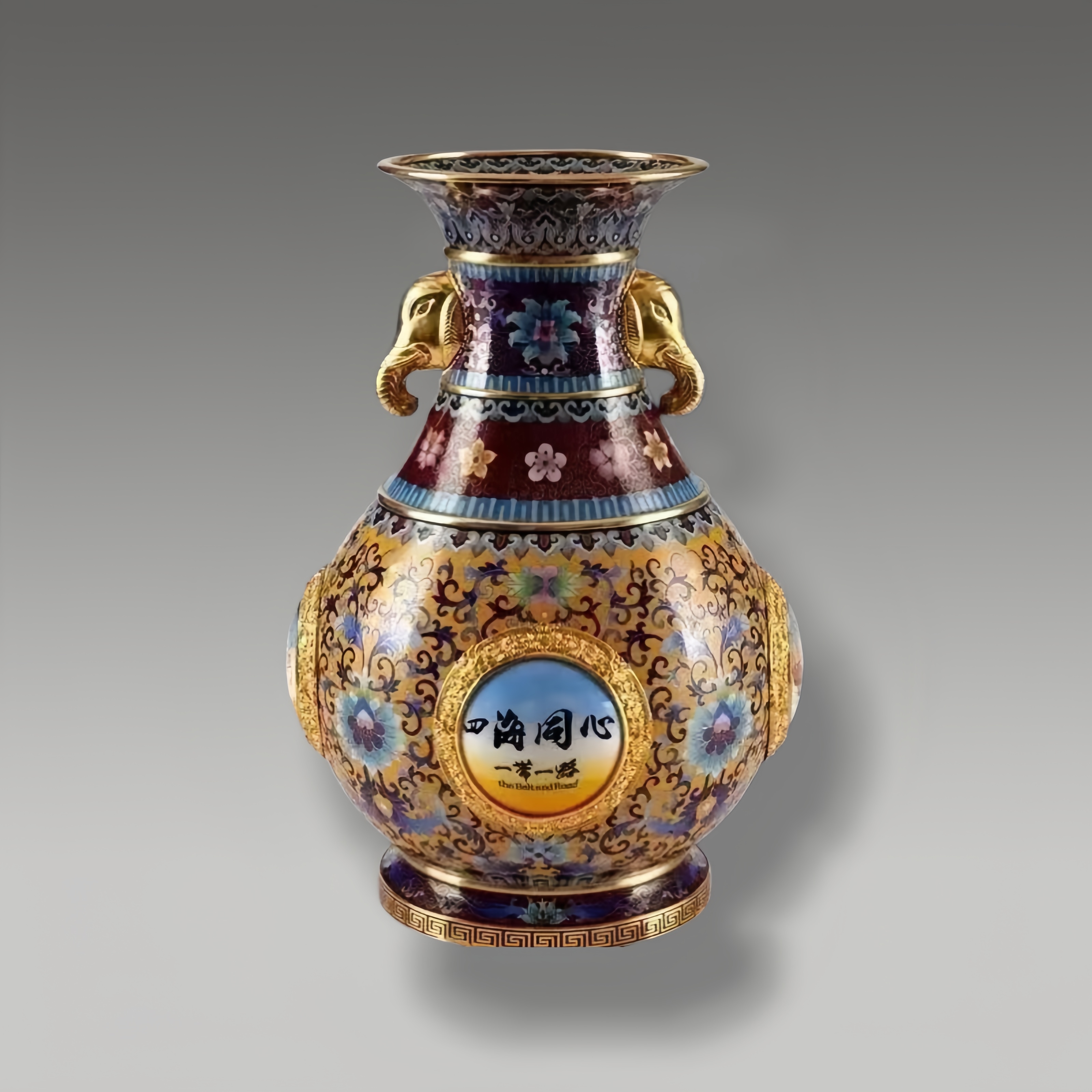 此非遗景泰蓝《四海同心》赏瓶,由大师亲制、中工美监制,为国礼级藏品。铜胎掐丝珐琅工艺精湛,器型端庄