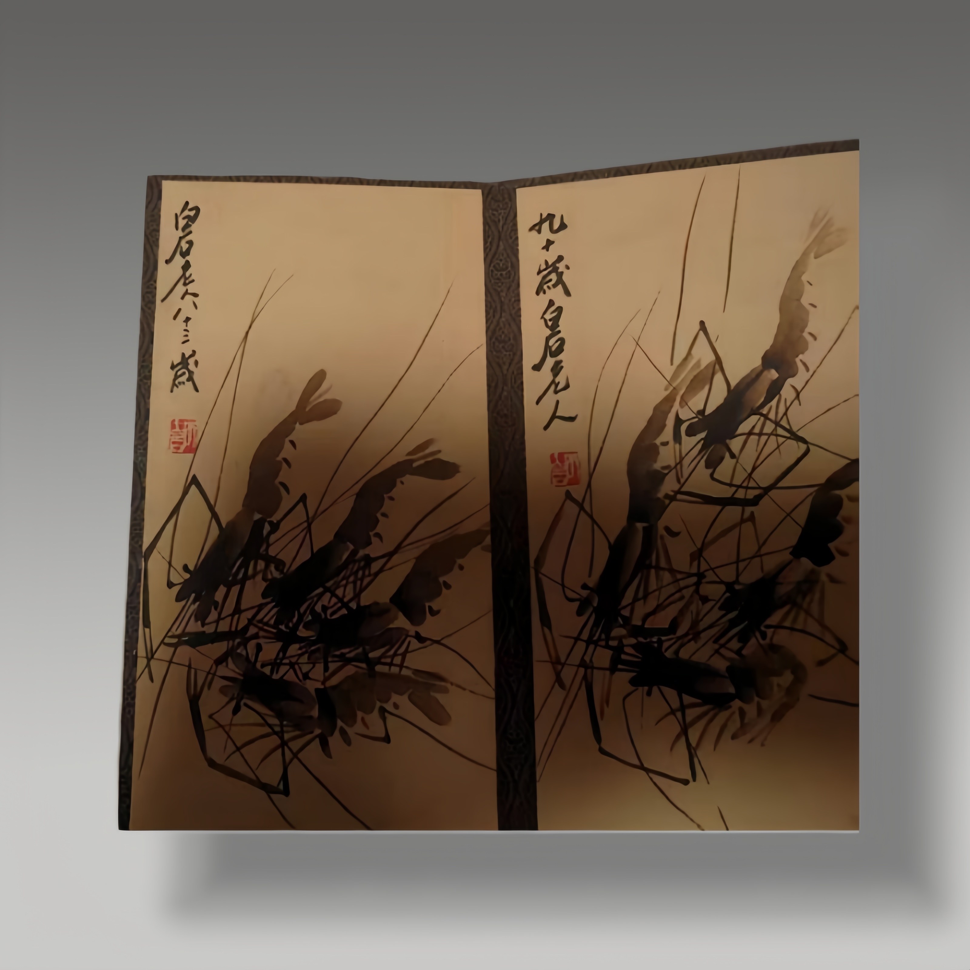 这幅墨虾图尽显大师功底!淡墨晕染虾身,通透灵动似有波光流转;浓墨点睛,长臂钢劲,须爪轻盈飘逸