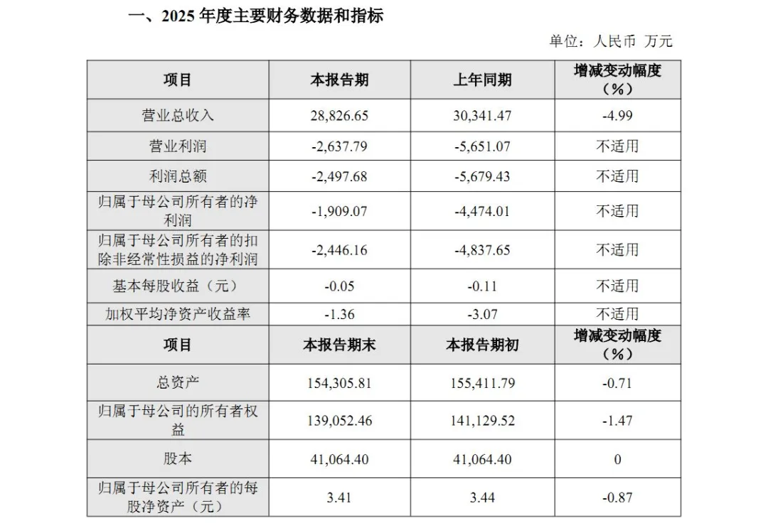 根据公司今年2月发布的2025年度业绩快报,公司全年实现营业总收入2.88亿元,较上年同期减少4.99%;归属于母公司所有者的净利润为-1909.07万元,较上年减亏57.33%;归属于母公司所有者的扣除非经常性损益的净利润为-2446.16万元,上年同期为-4837.65万元。