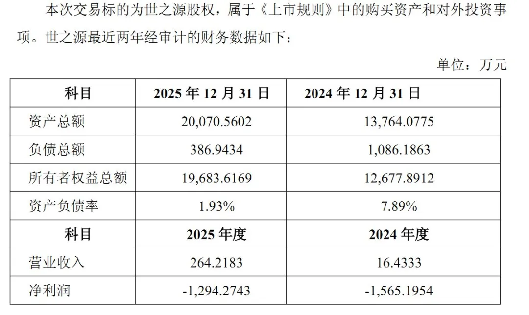 需要注意的是,世之源目前尚未实现盈利,其创新药均处于临床研究阶段。2024年和2025年,世之源的营业收入分别为16.43万元、264.22万元,净利润分别为-1565.20万元、-1294.27万元。截至2025年末,其资产总额达到2亿元,所有者权益总额为1.97亿元,资产负债率为1.93%。