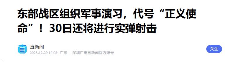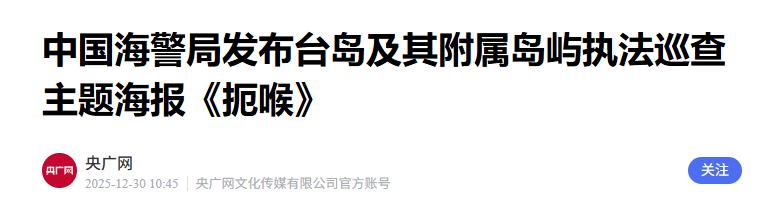 就在东部战区展开“正义使命-2025”对台军演的同时,中国海警也在台岛周边出手了。中国海警官方账号12月30日宣布,继续组织舰艇编队在台湾岛周边临近海域进行执法巡查,同时发布名为“扼喉”的最新海报。