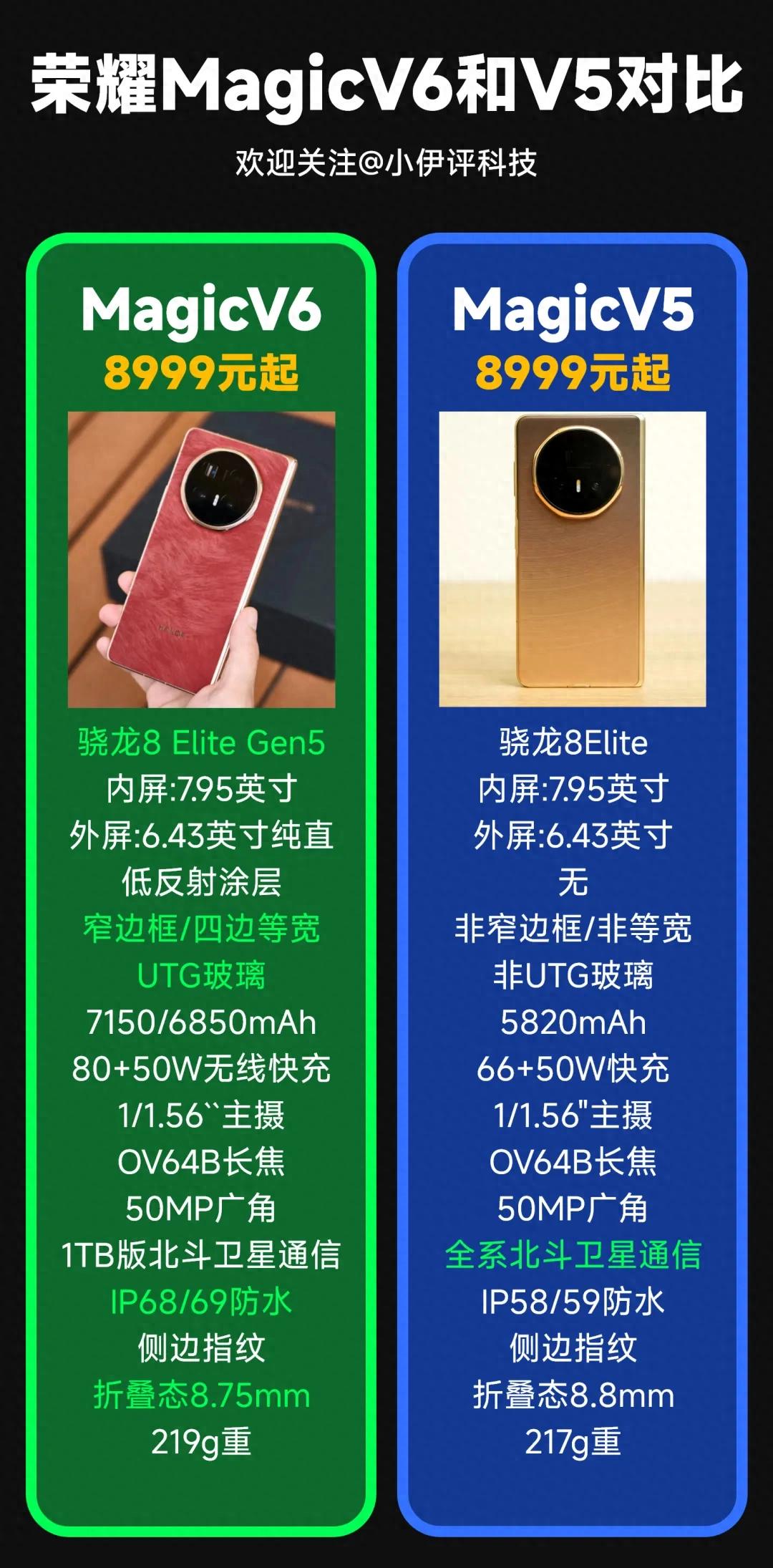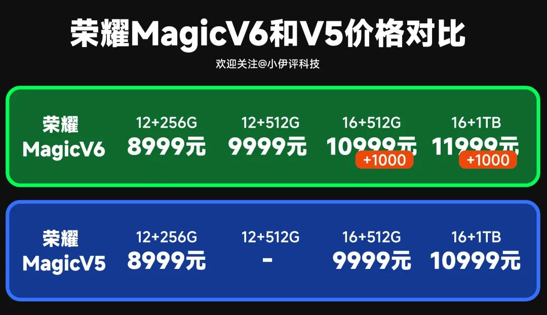 荣耀Magic V6已经正式发布了,起步价还是8999元,先给大家来一个一图流以及价格一图流对比(对比前代),如下图所示: