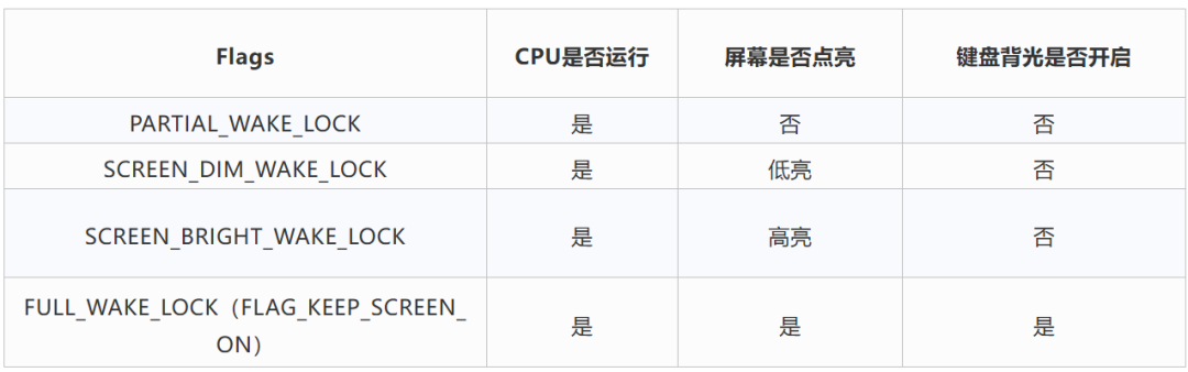 FULL_WAKE_LOCK:当屏幕和键盘背景光都常亮的时候CPU不休眠,如果关闭背景光则释放该锁。