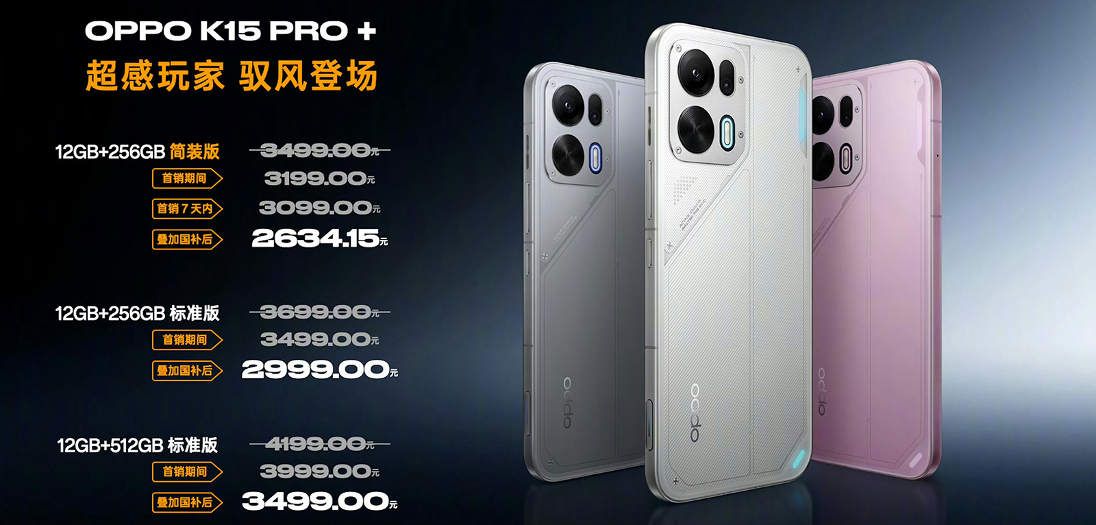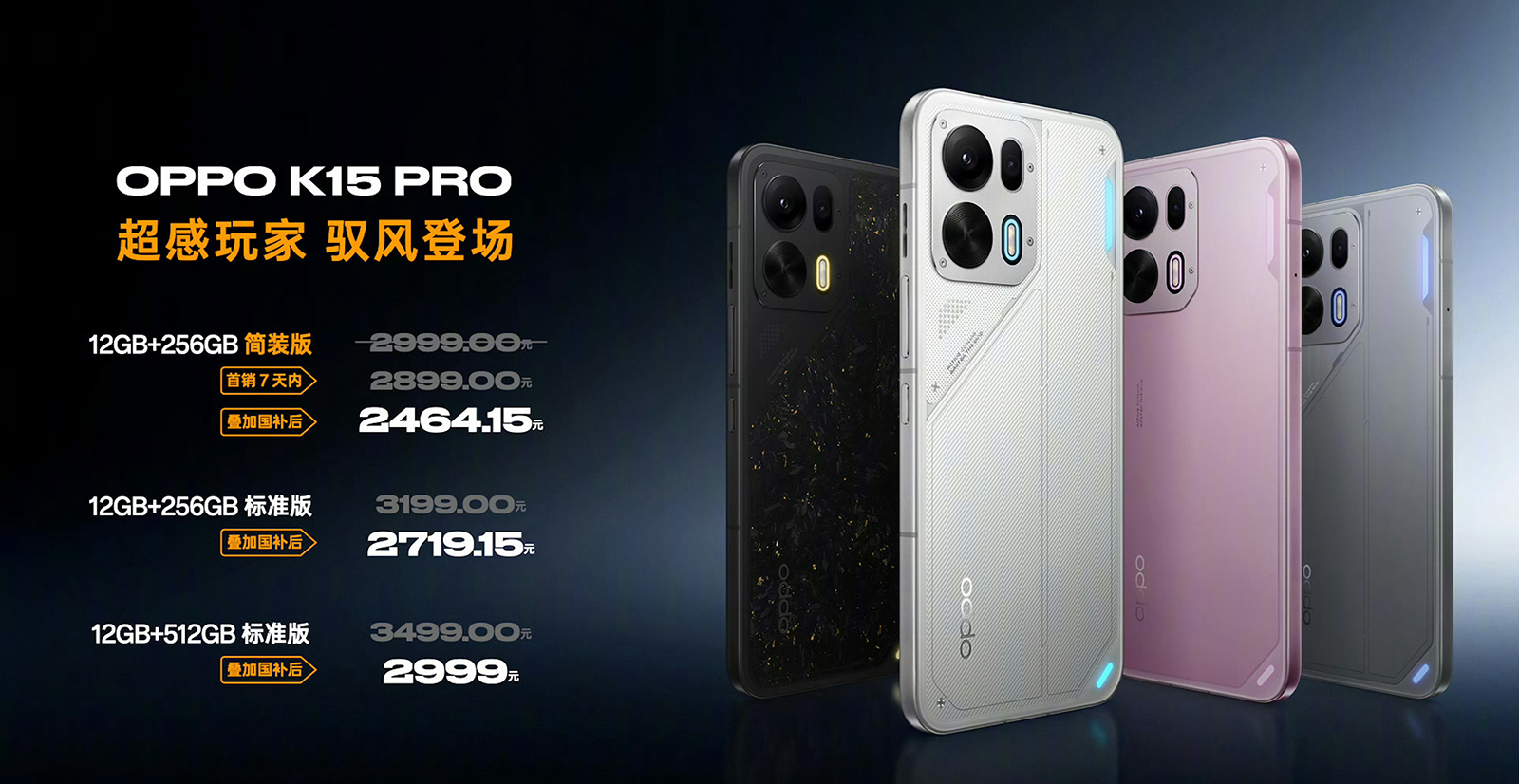 价格方面,OPPO K15 系列官方起售价为2999元。官方同步推出重磅首销优惠,首销前7天叠加国家补贴后,K15 Pro简装版到手价仅2464.15元起,K15 Pro +简装版到手价2634.15元起,进一步拉低了旗舰级电竞体验的入手门槛。