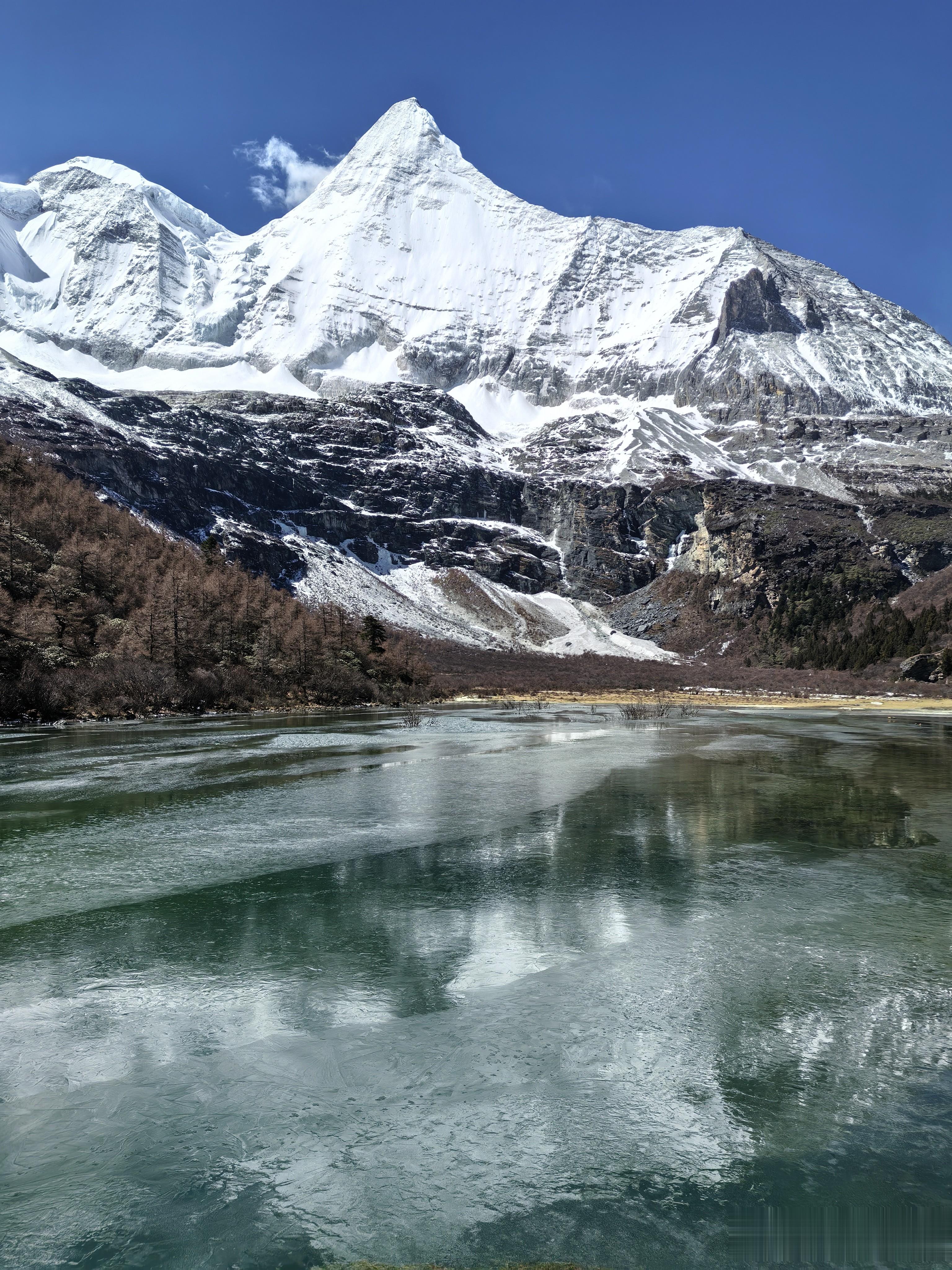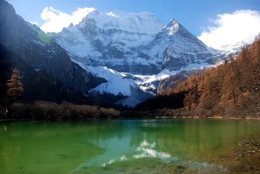 稍作停留,继续向前。海拔4100米处,我遇见了名副其实的"珍珠"——珍珠海。这片藏在密林间的高原湖泊,碧绿温润,波光粼粼,就像一块巨大的翡翠镶嵌在雪山脚下。湖水清澈得能看见水底的每一颗石子,阳光洒在上面,反射出点点金光。我赶紧坐下,吸几口氧气,调整一下呼吸,顺便打卡拍照。这地方,不拍照简直对不起自己!